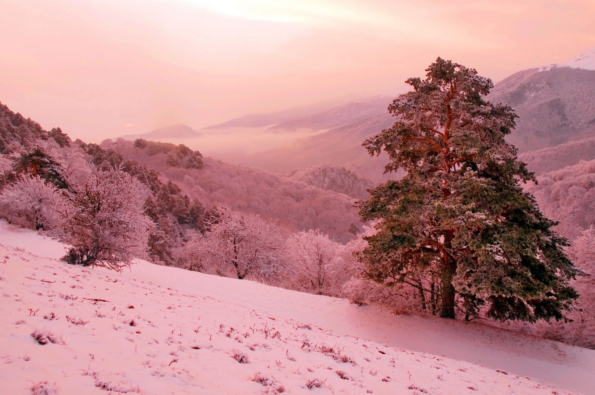 Burg auf dem Berg, rosa-violetter Himmel, Dämmerung