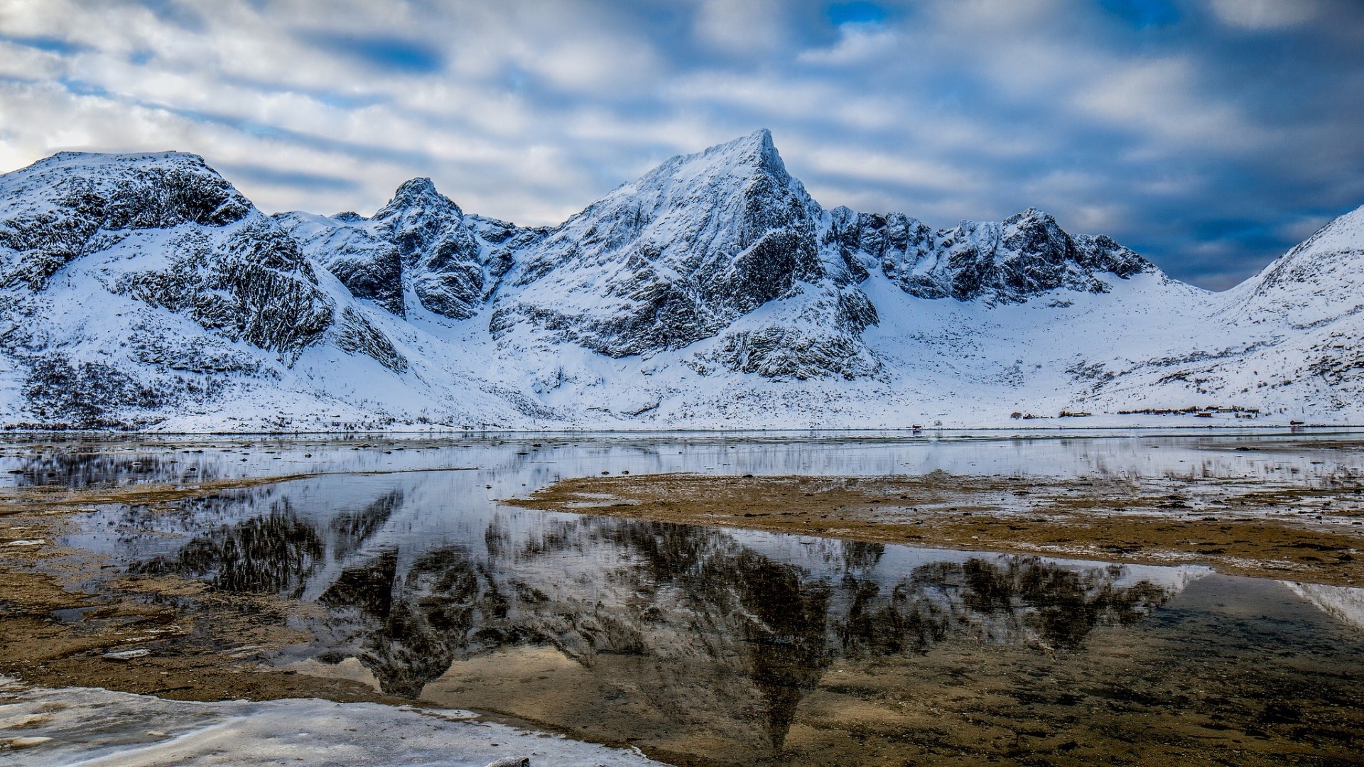 Schneebedeckte Berge spiegeln sich im Wasser des Sees wider