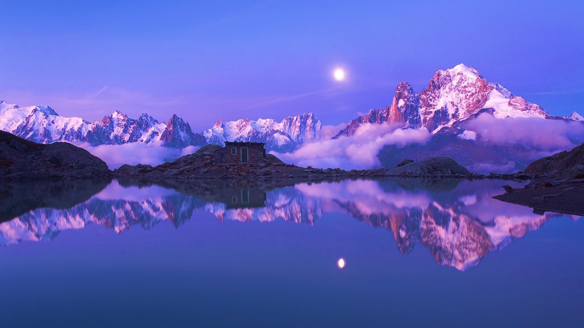 Bild eines Sonnenuntergangs zwischen Bergen und Flüssen