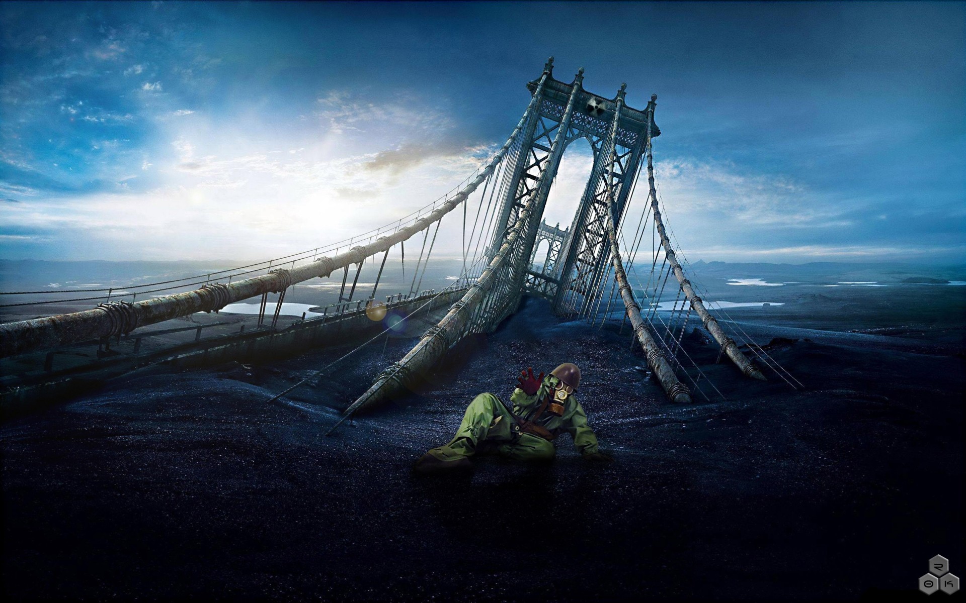 Bild einer gefallenen Brücke im Ozean vor Sonnenuntergang Hintergrund
