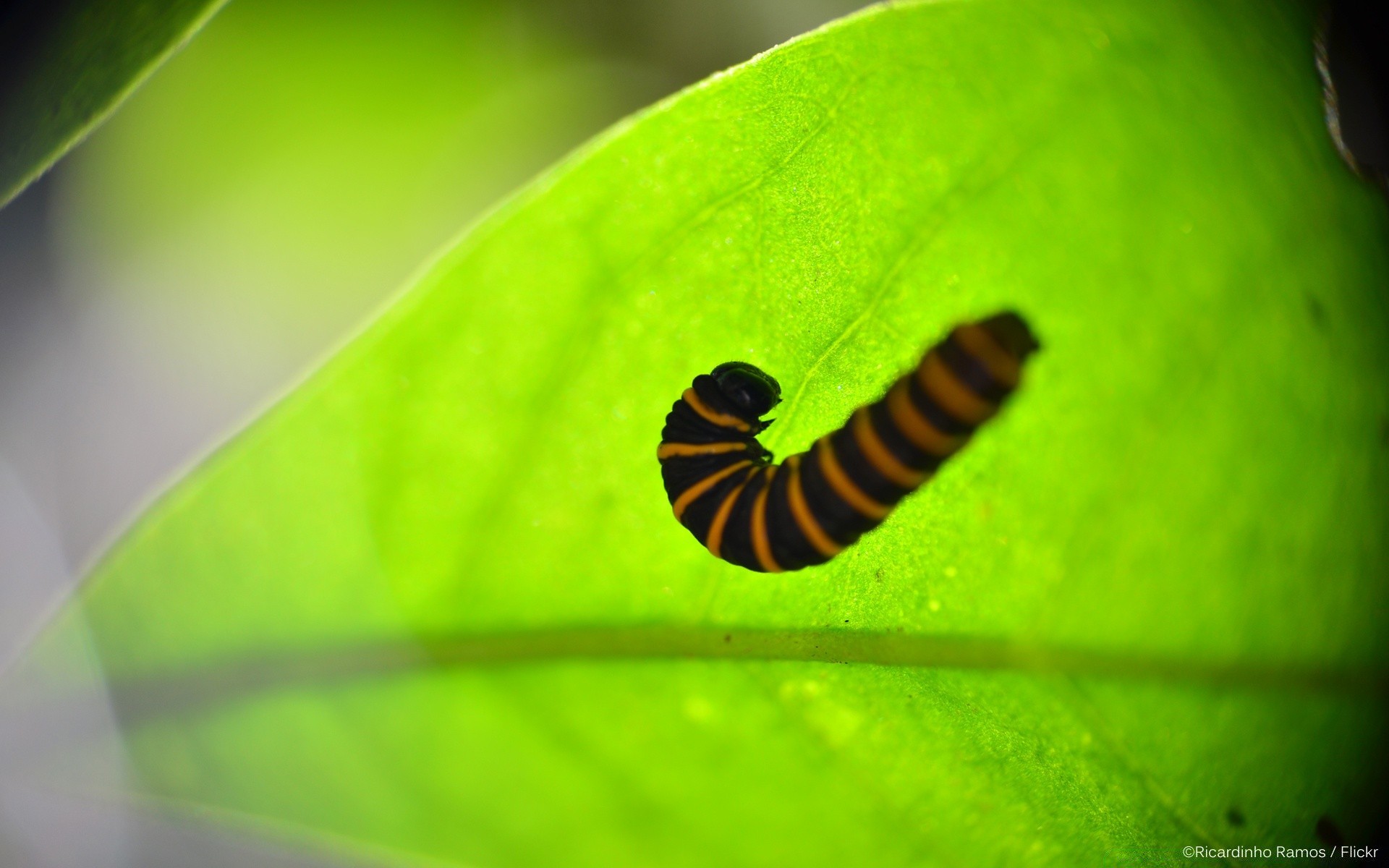 Eine gestreifte Raupe sitzt auf einem Blatt
