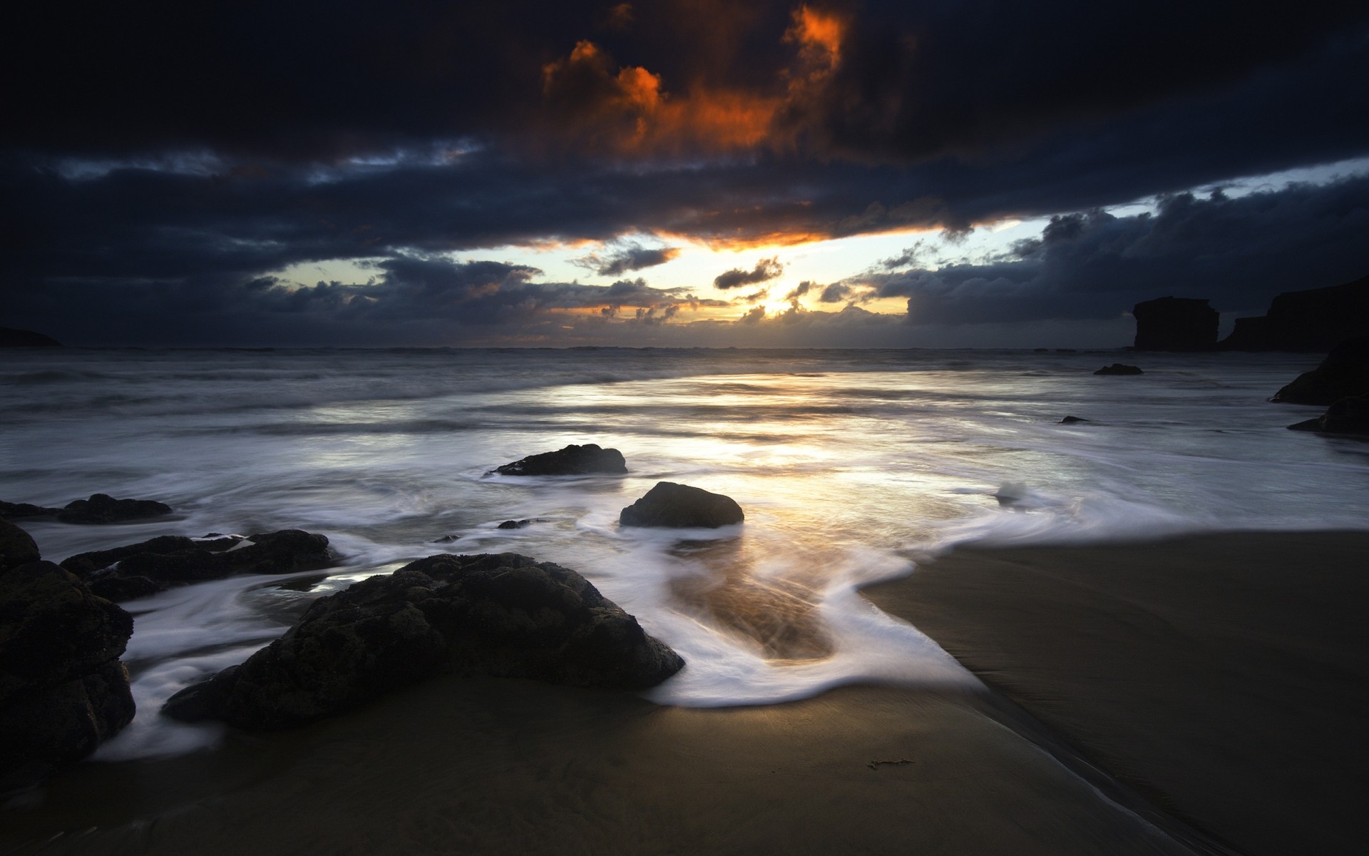Sonnenstrahlen vor dem Hintergrund des dunklen Himmels und des Meeres