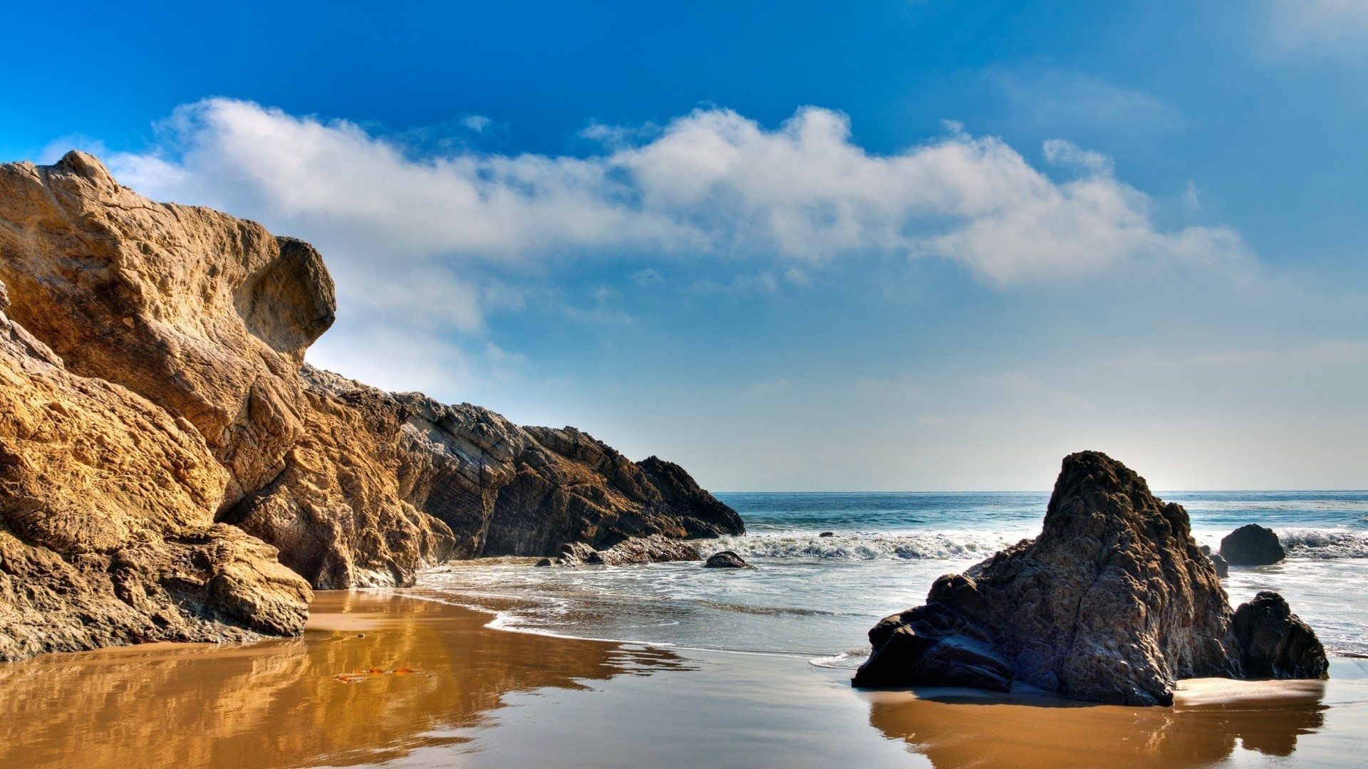 Bildschirmschoner Wellen und Steine im Wasser, blauer Himmel