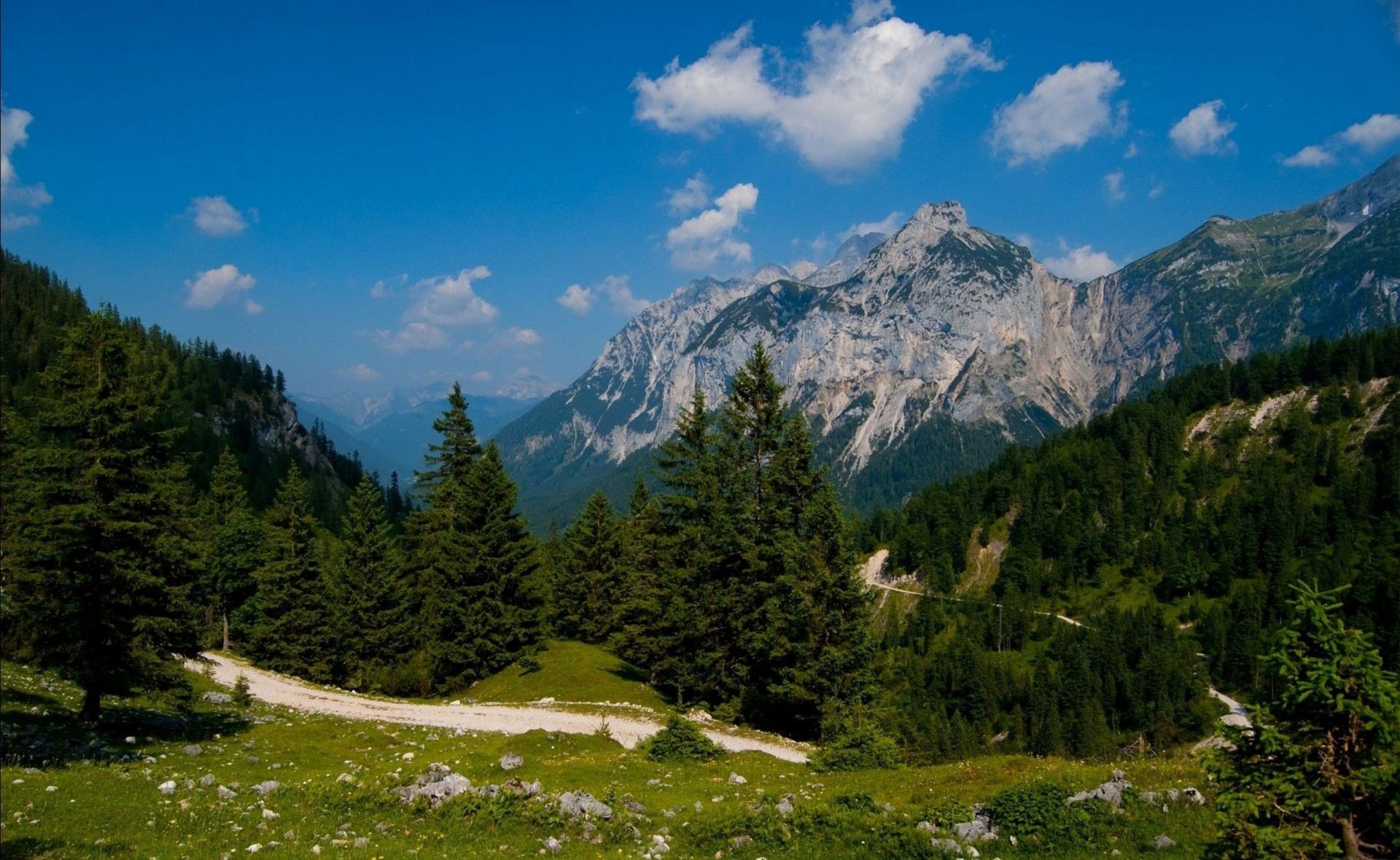 Berge blauer Himmel Wolken grün Fichte und Straße