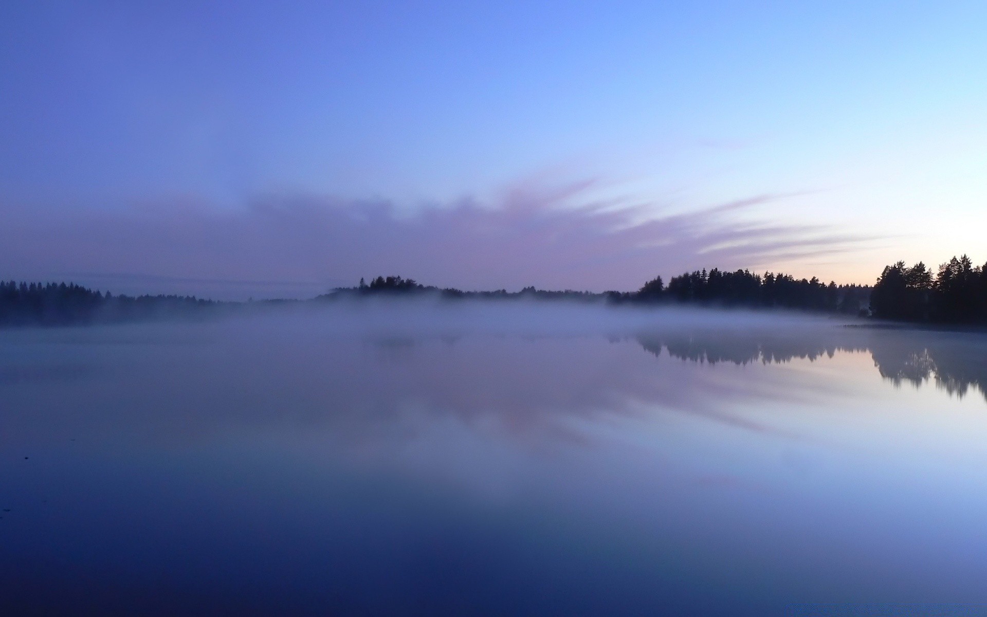 Blauer Sonnenuntergang über dem See. Dämmerung am Wasser