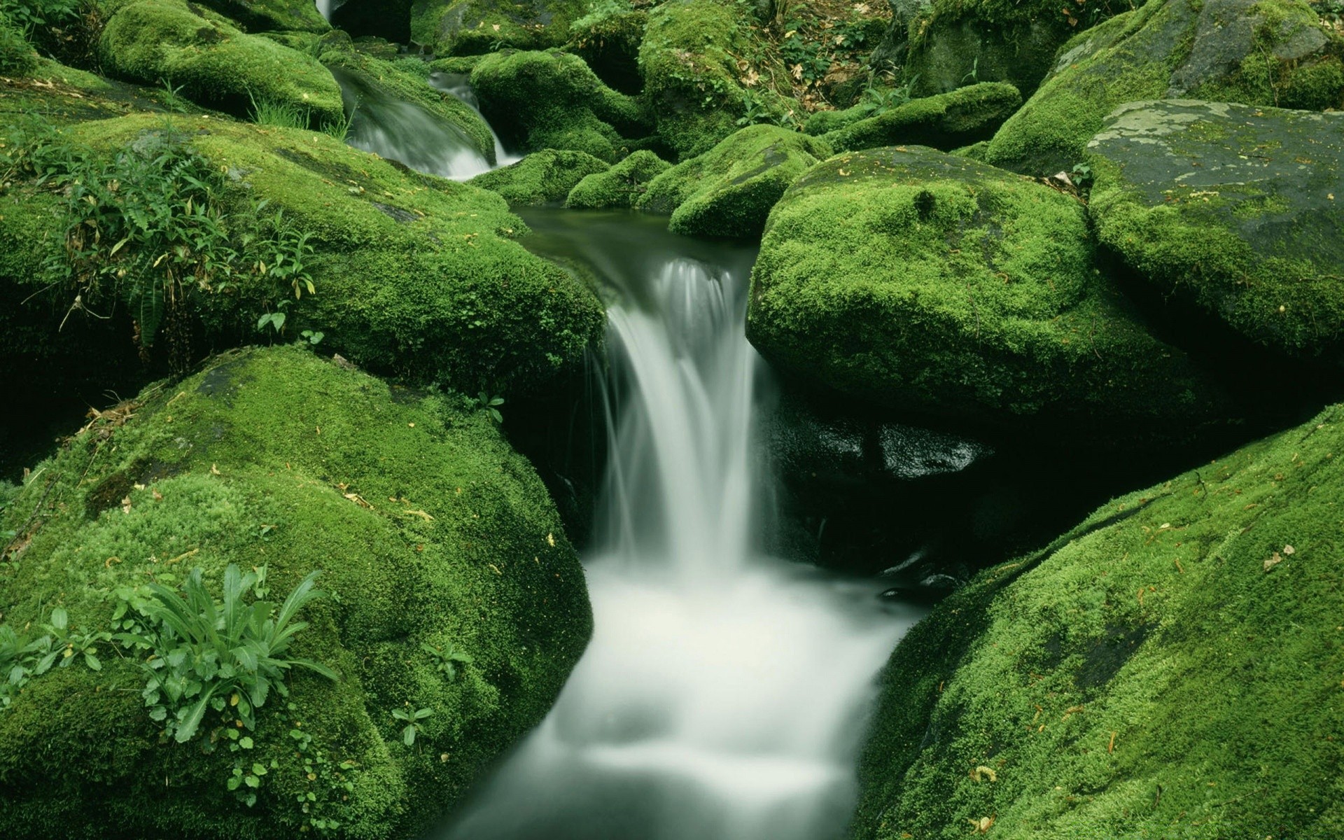 Fallender Wasserfall und grüner Wald im Morgengrauen