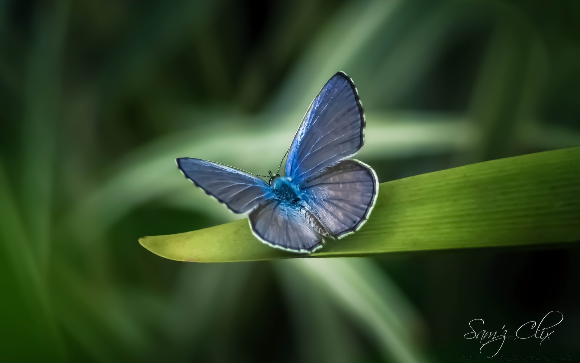 Blauer Schmetterling sitzt auf einem grünen Blatt