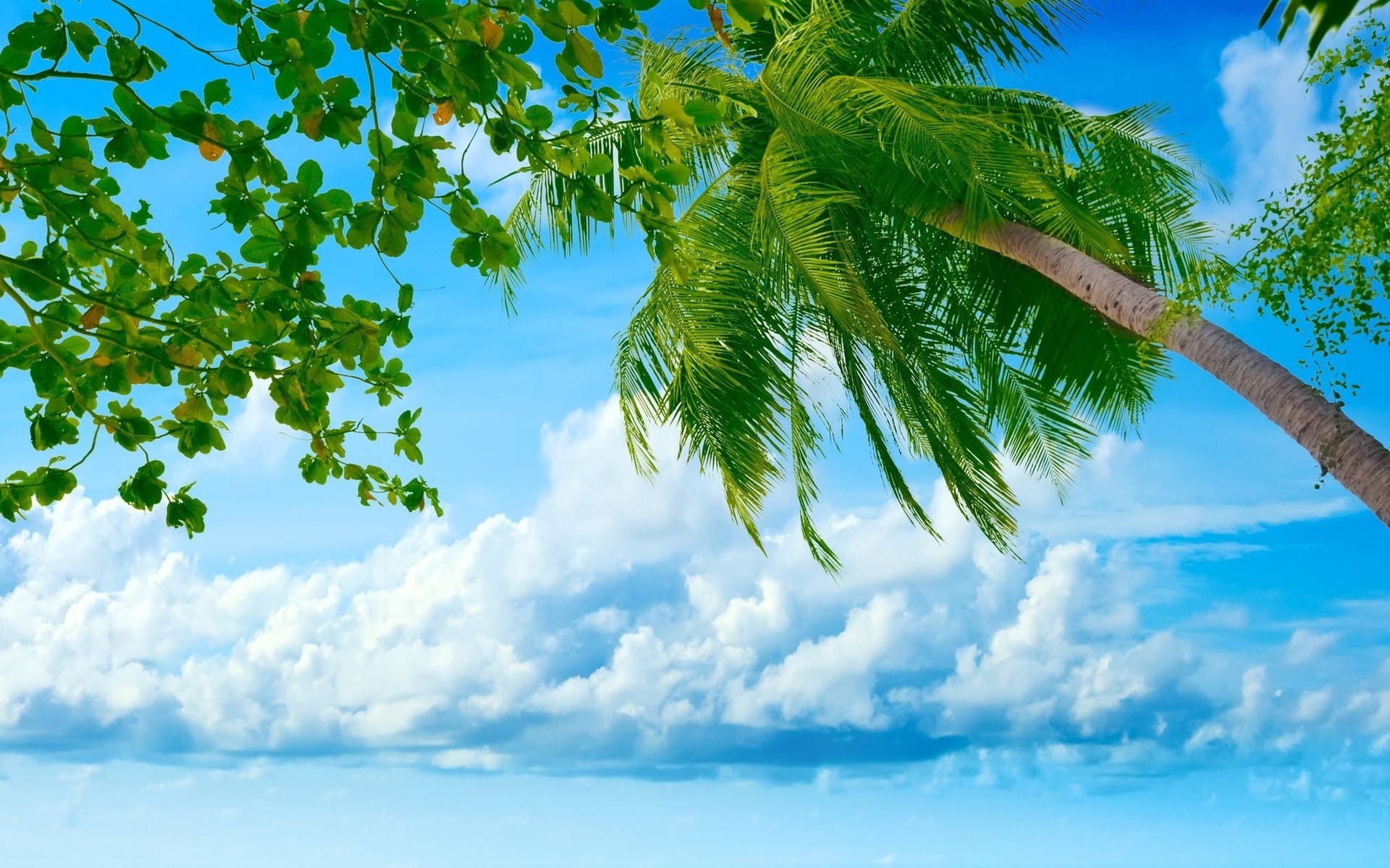 Tropische Vegetation und blauer Himmel mit weißen Wolken
