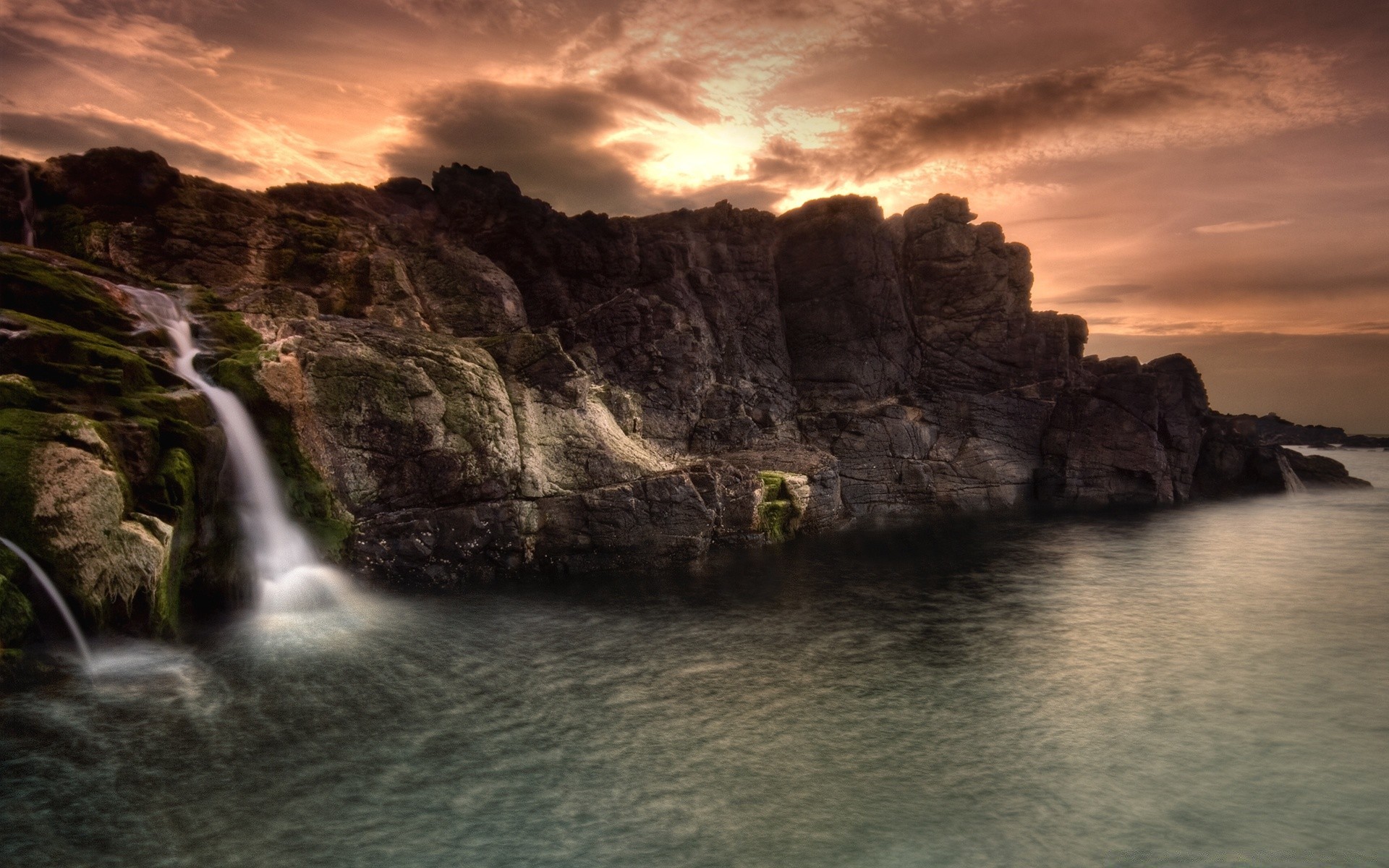 Wasserfall vor dem hintergrund eines schönen sonnenuntergangsWasserfall vor dem Hintergrund eines schönen Sonnenuntergangs