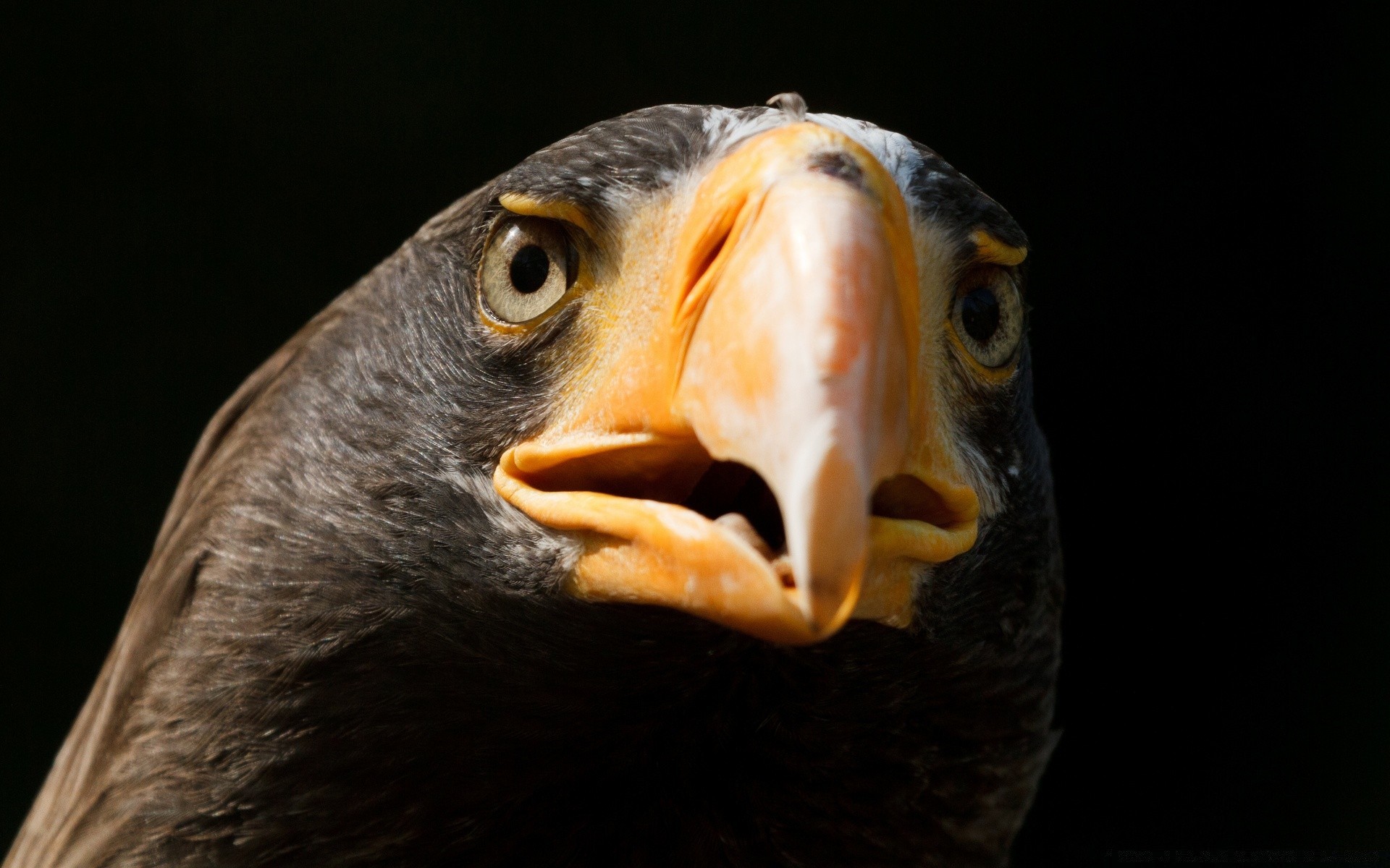 Räuberischer Blick eines Adlers. Vogel auf dunklem Hintergrund