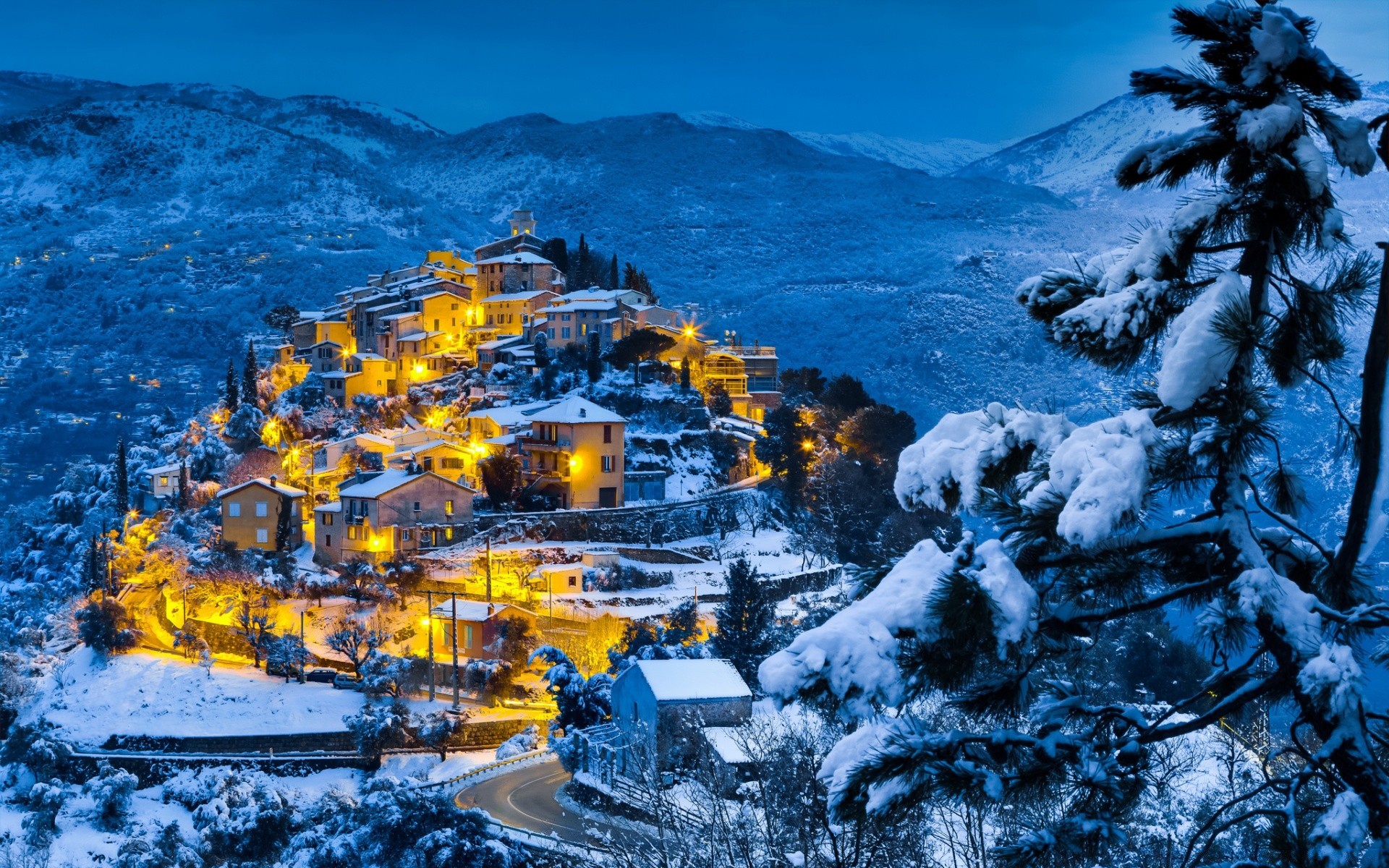 Palmen am Strand in der Abenddämmerung mit Blick auf den Berggipfel und die Bucht