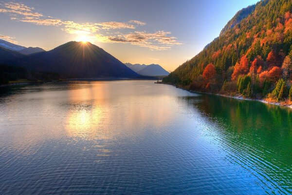 Umhüllter blick auf den sonnenuntergang die sonne am flussuferUmhüllter Blick auf den Sonnenuntergang die Sonne am Flussufer