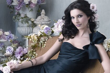 Braut mit Blumensträußen und einer Rose im Haar