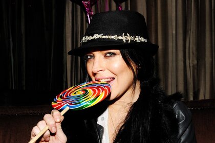 Mädchen mit Hut. Karamell auf einem Stock. Mädchen mit Süßigkeiten