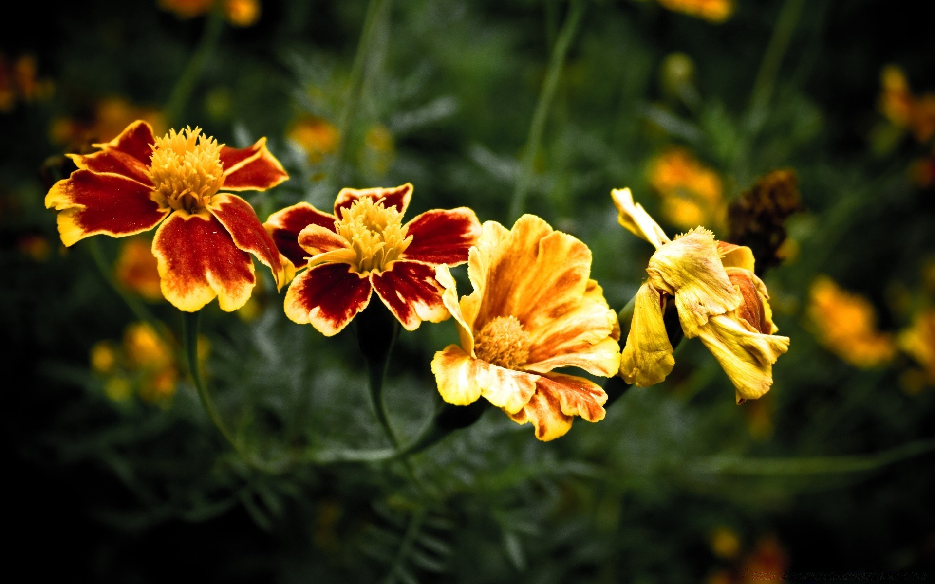 Blumenstrauß aus gelben und violetten blüten auf dunklem hintergrundBlumenstrauß aus gelben und violetten Blüten auf dunklem Hintergrund