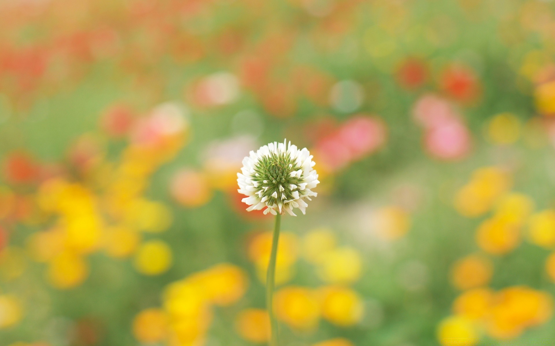 Ein entzückender Löwenzahn, der unter anderen Blumen aufsteigt