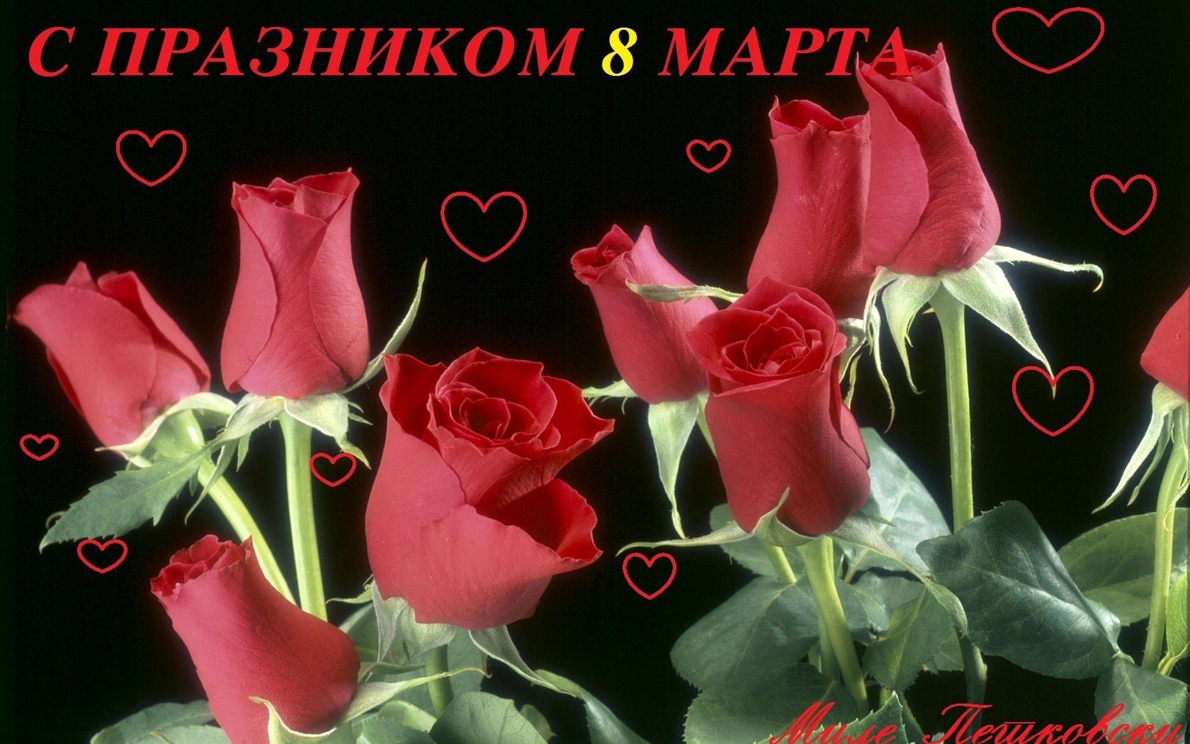Rosen und Glückwünsche zum 8. März auf schwarzem Hintergrund mit Herzen