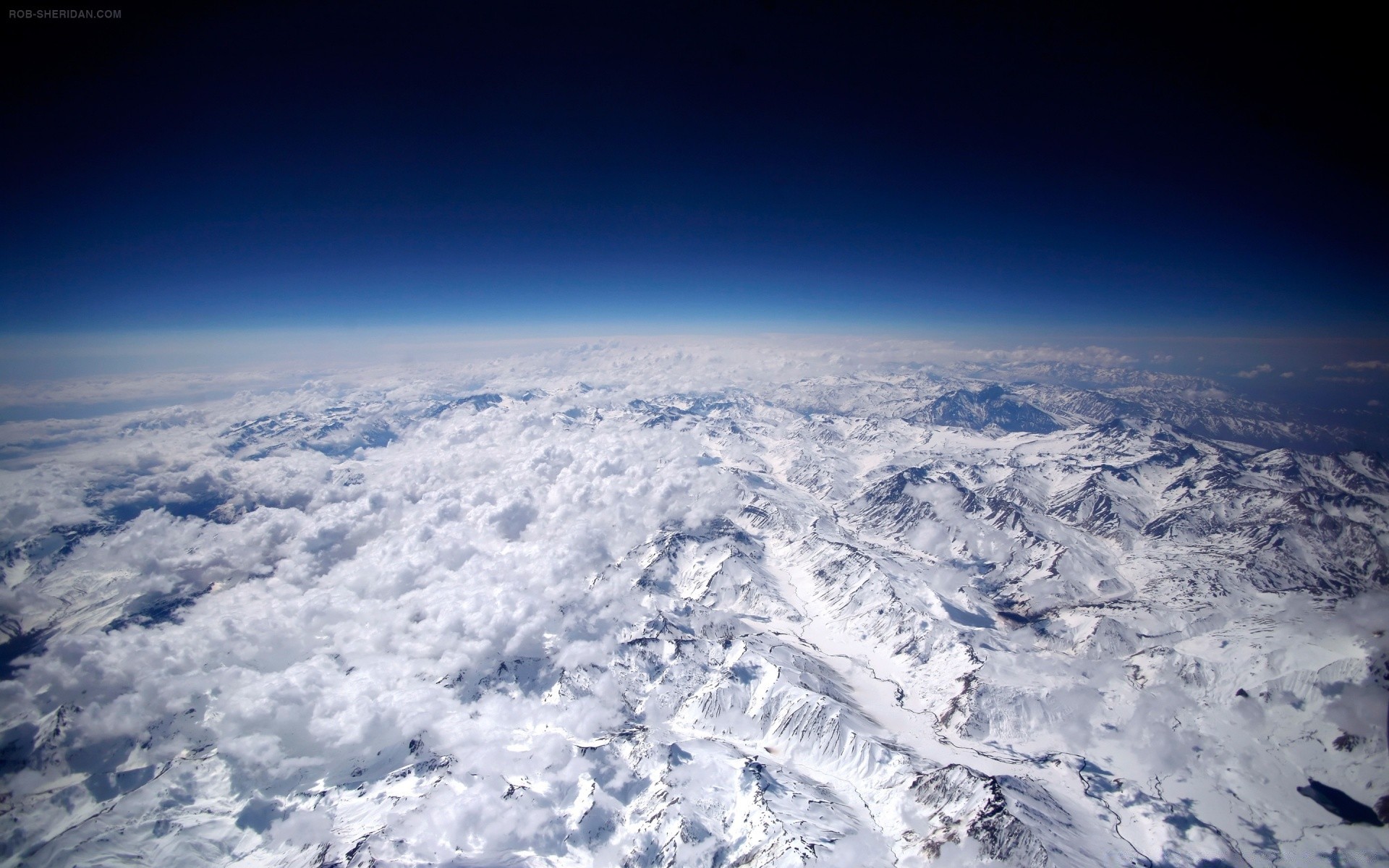Blick von oben auf Fichten im Schnee und Nebel darunter