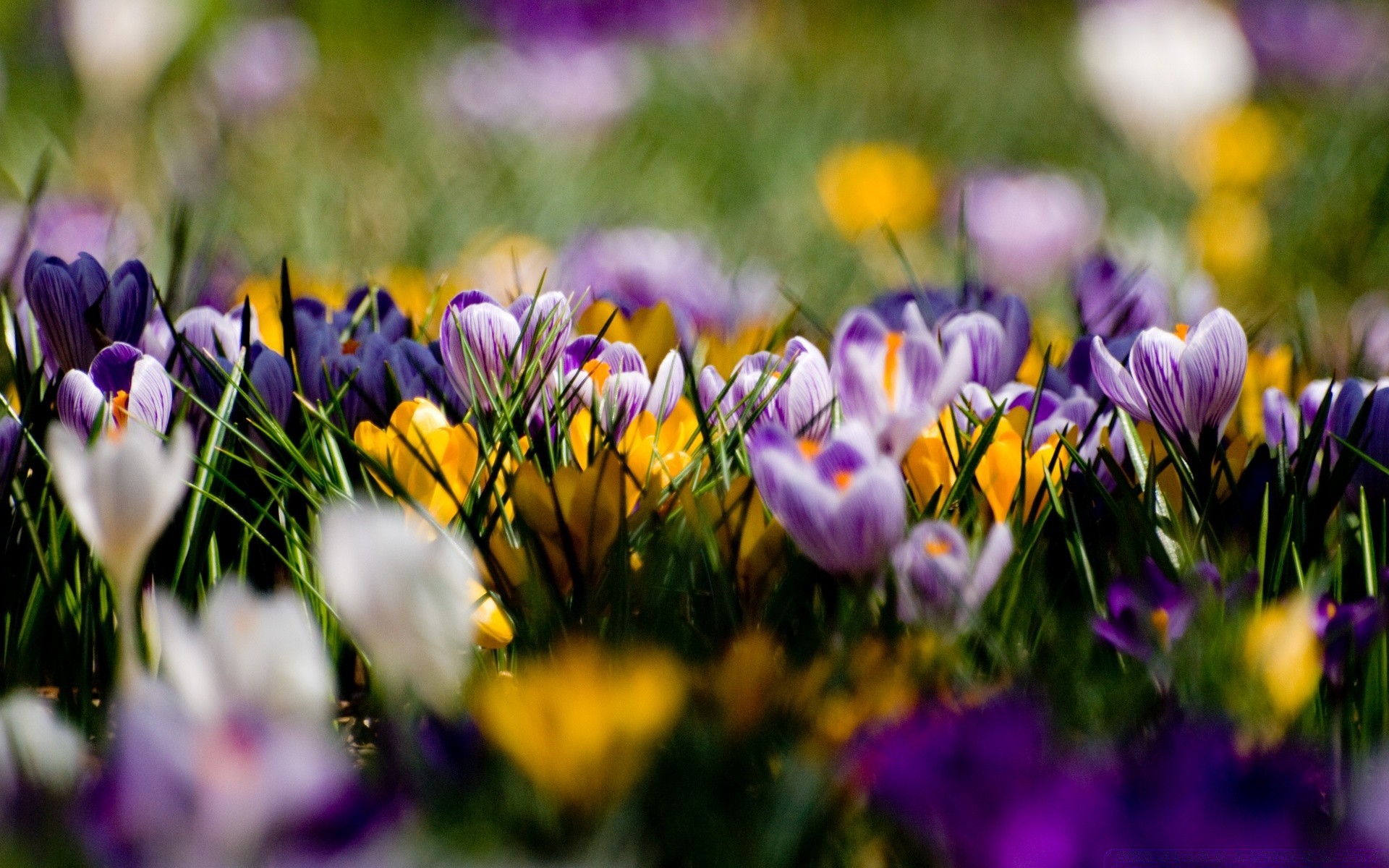 Bunte Krokusse im grünen Laub