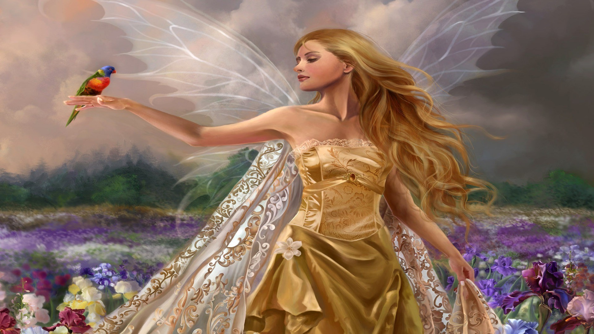 Fee mit Vogel auf der Hand auf dem Blumenfeld