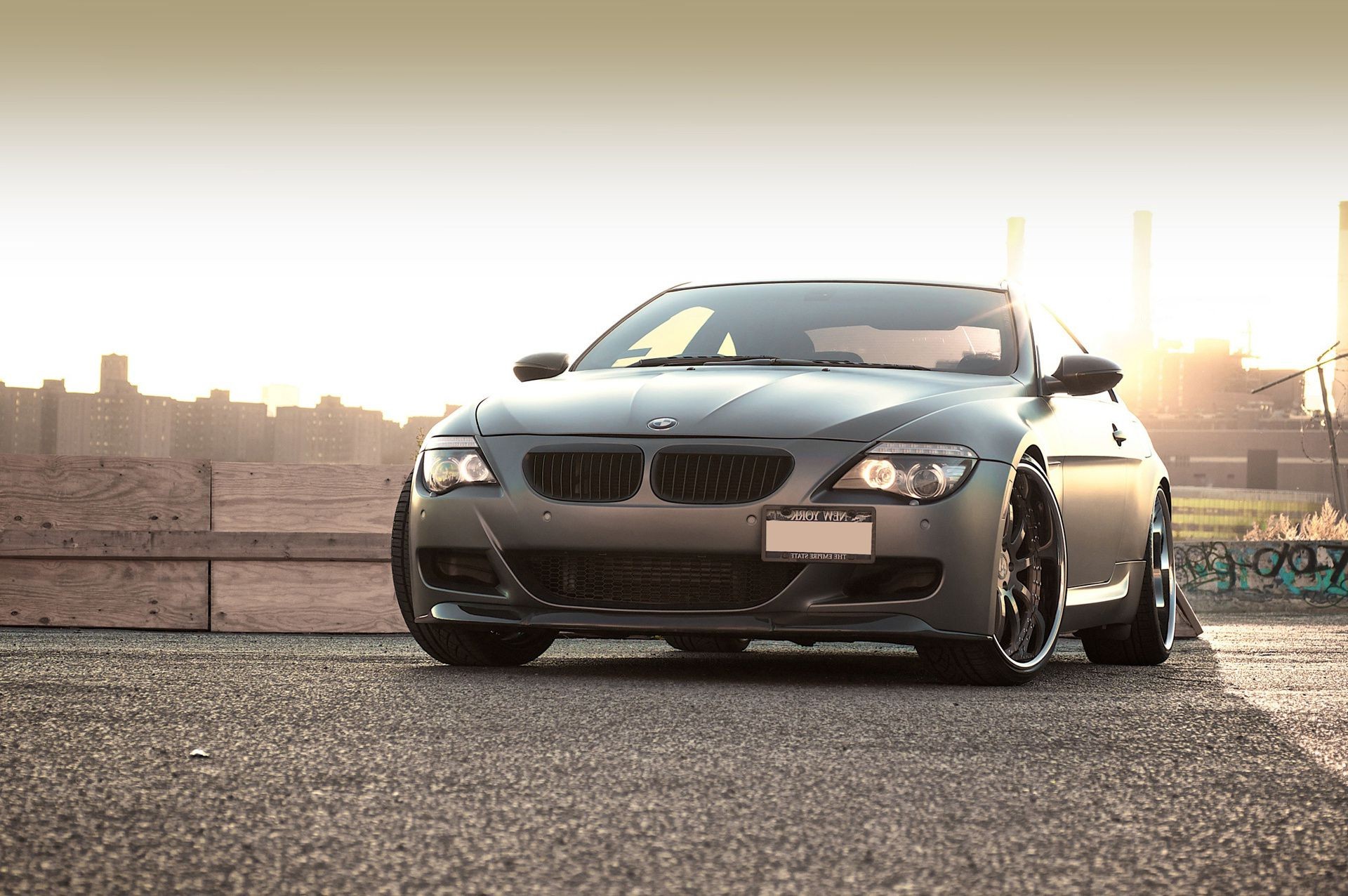 Ein weißer BMW fährt die Straße entlang. An den Seiten der Bäume