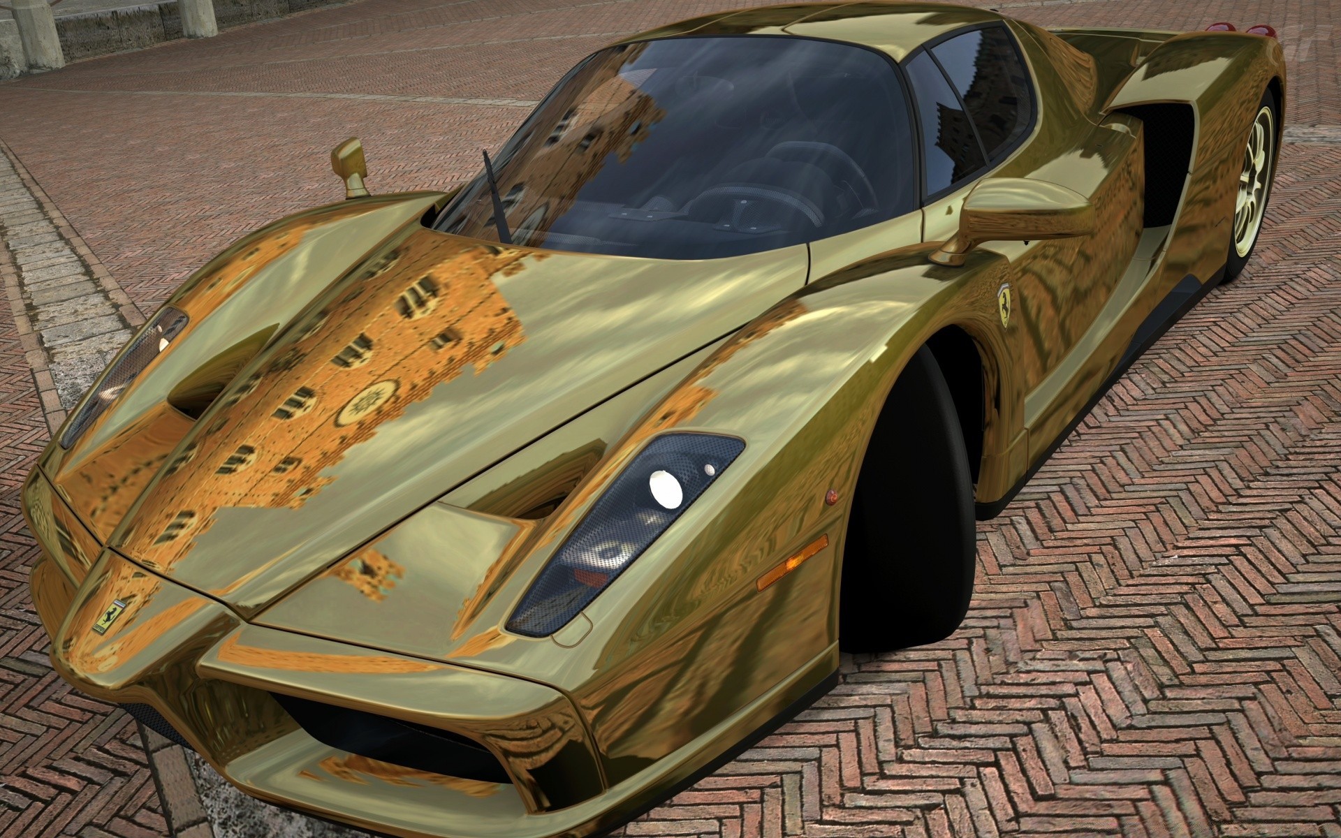 Goldener Porsche mit Reflexion auf der Motorhaube des Gebäudes