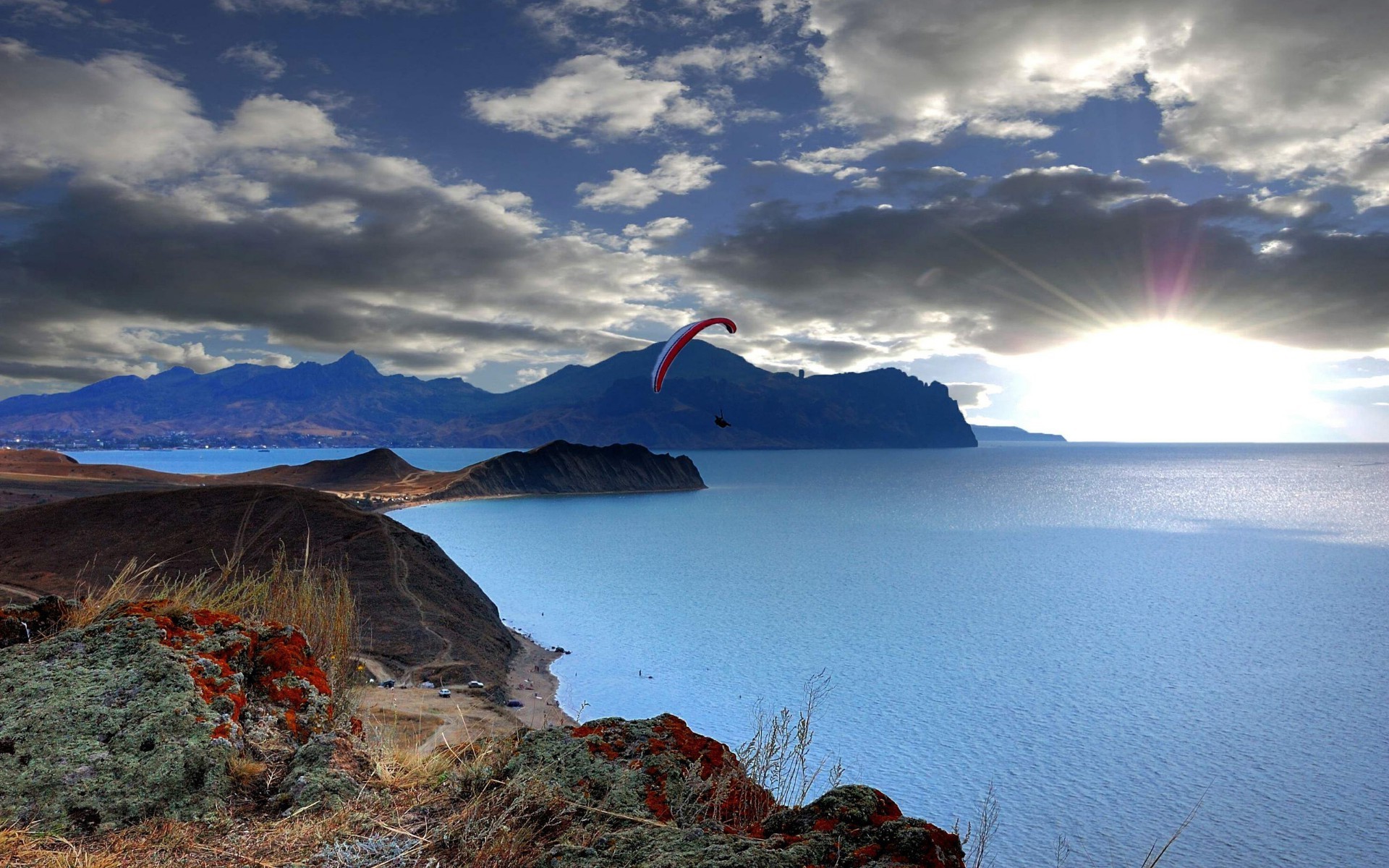 Ein Gleitschirmspringer fliegt über den See