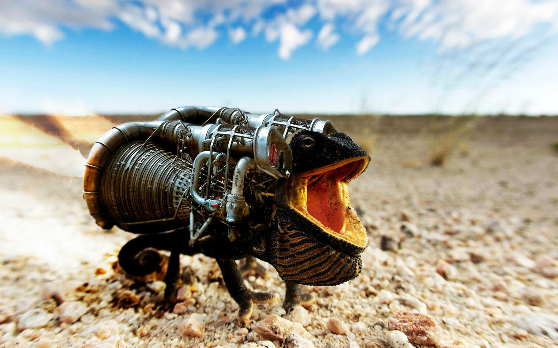 Ein fantastischer Kämpfer mit einer Waffe auf dem Rücken, ein Chamäleon mit weit offenem Mund