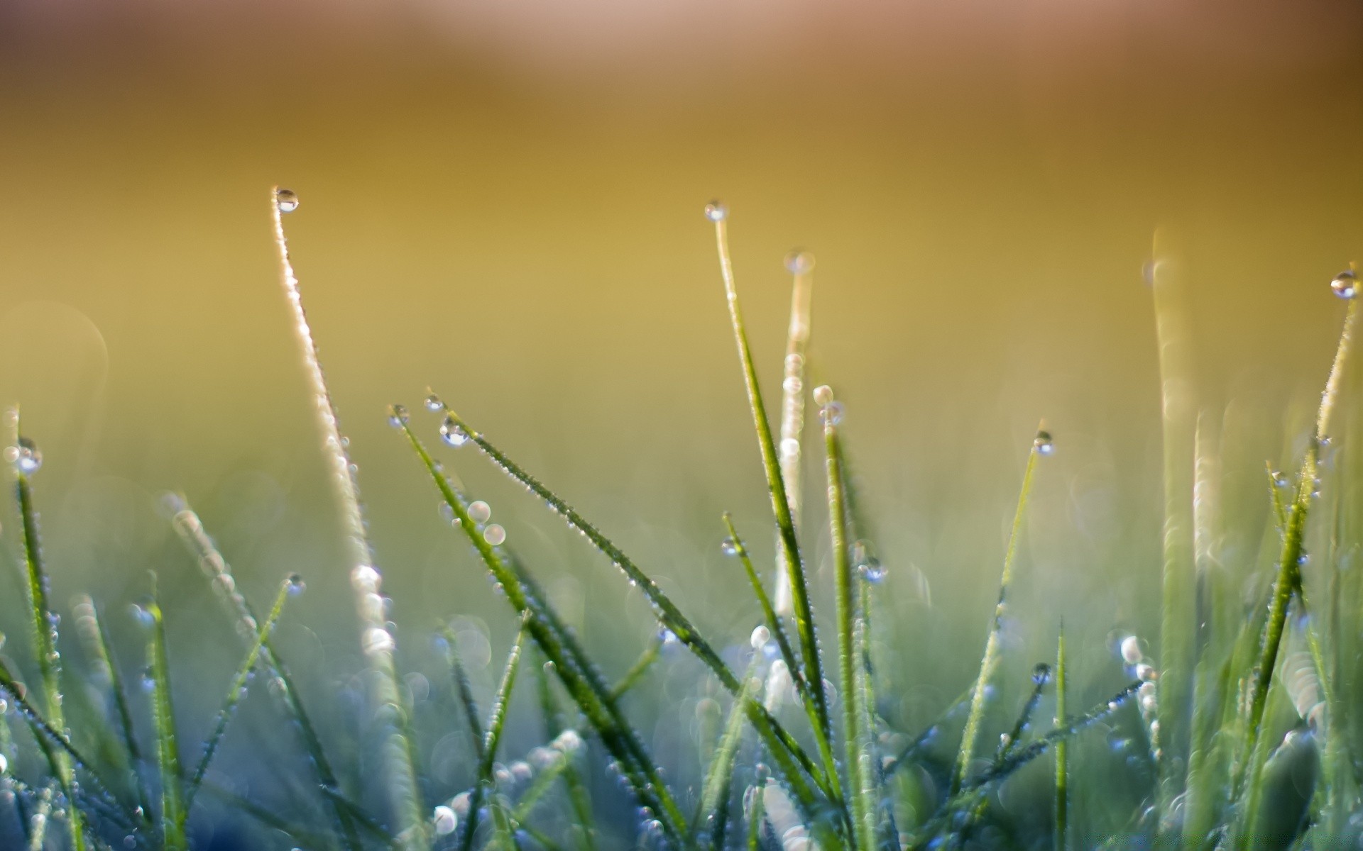 Schillernde Tautropfen auf dem Gras bei Tageslicht