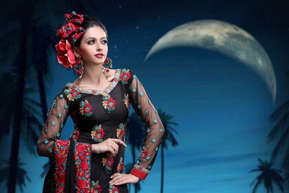Mädchen im schwarzen kleid mit roten blumen ina riesigen mond hintergrundMädchen im schwarzen Kleid mit roten Blumen ina riesigen Mond Hintergrund