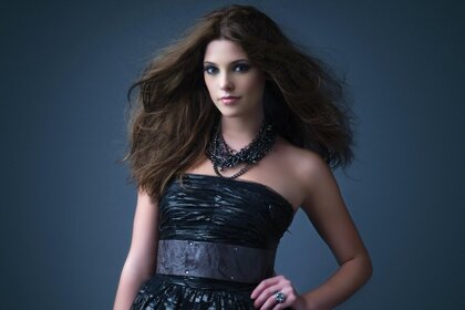 Eine frau mit einer modischen frisur posiert halb sitzendEine Frau mit einer modischen Frisur posiert halb sitzend