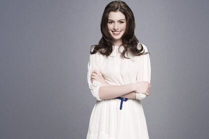 Lächelnde berühmte schauspielerin auf dem hintergrund des emblemsLächelnde berühmte Schauspielerin auf dem Hintergrund des Emblems