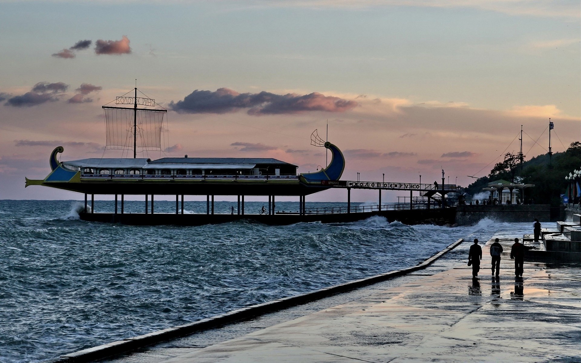 Auf dem Hintergrund des Himmels über dem Wasser ein Mann auf einer Tafel