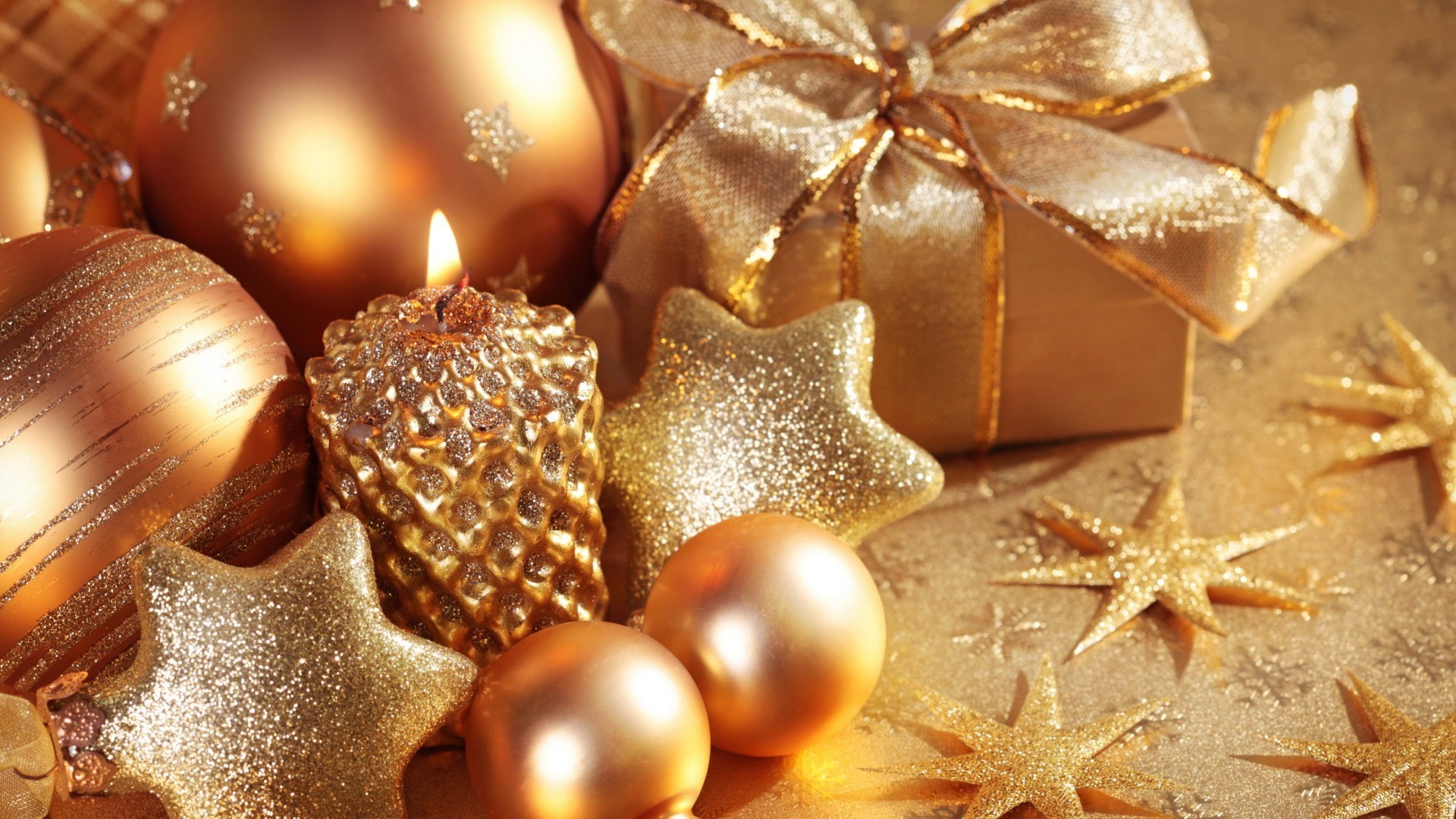 Goldene Postkarte mit Sektgläsern und Geschenken