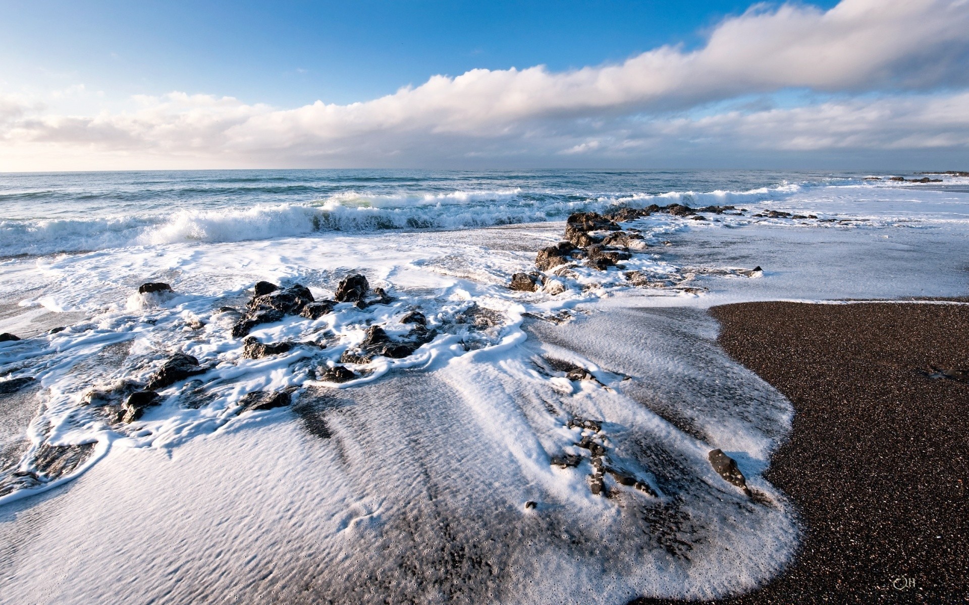 Wolken am blauen Himmel und türkisfarbene Wellen