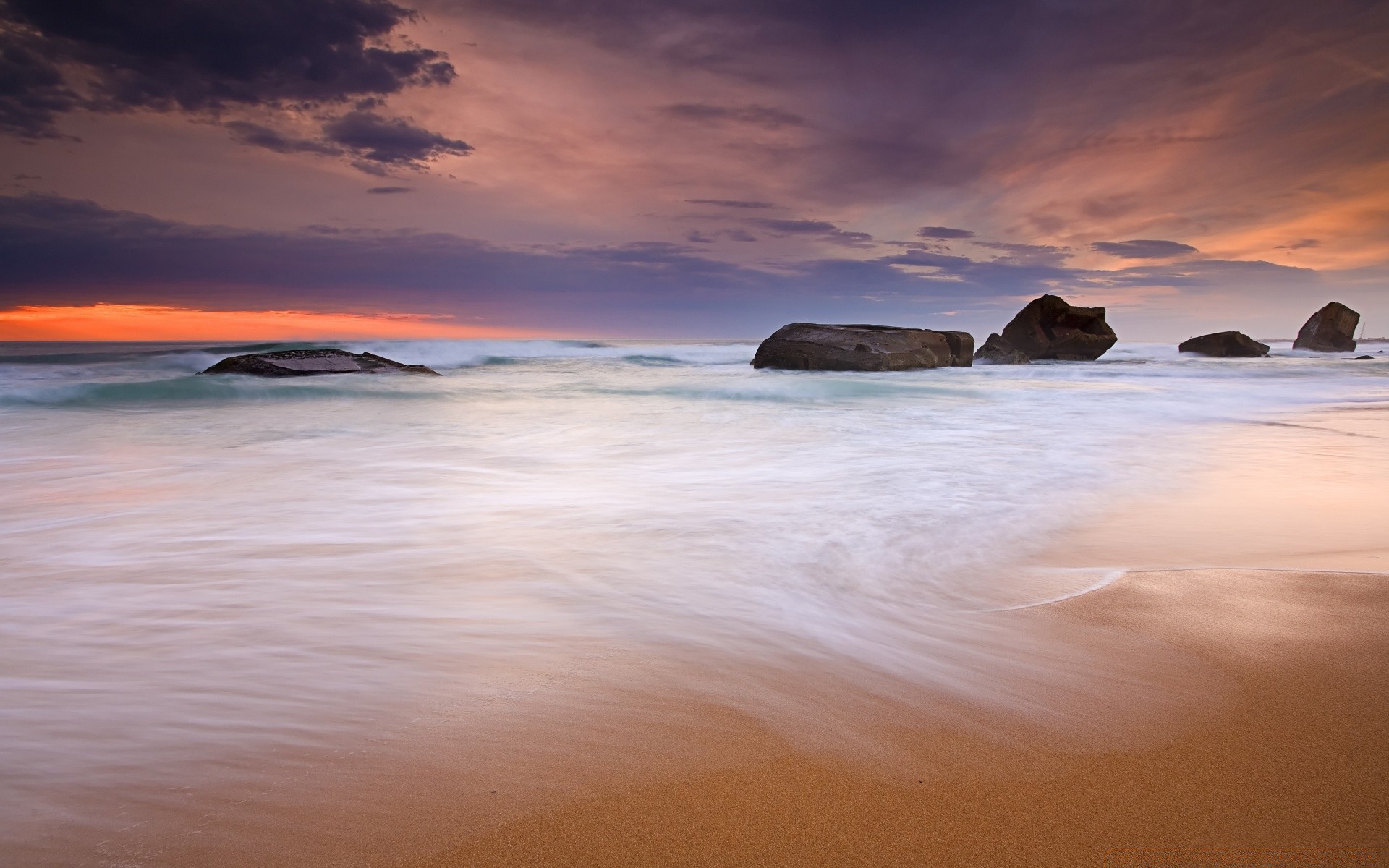 Große felsbrocken im sand gehen bei einem gelb-roten sonnenuntergang ins meerwasserGroße Felsbrocken im Sand gehen bei einem gelb-roten Sonnenuntergang ins Meerwasser