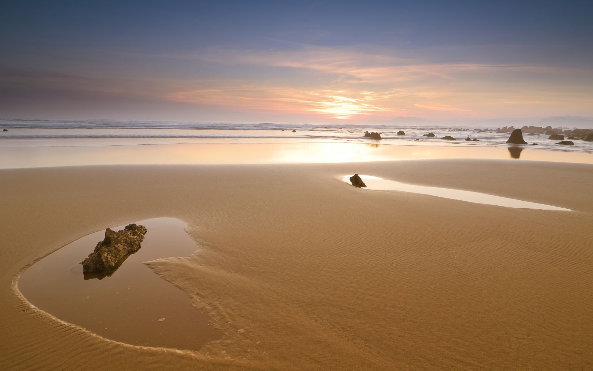 Sandstrand mit Steinen bei Sonnenuntergang