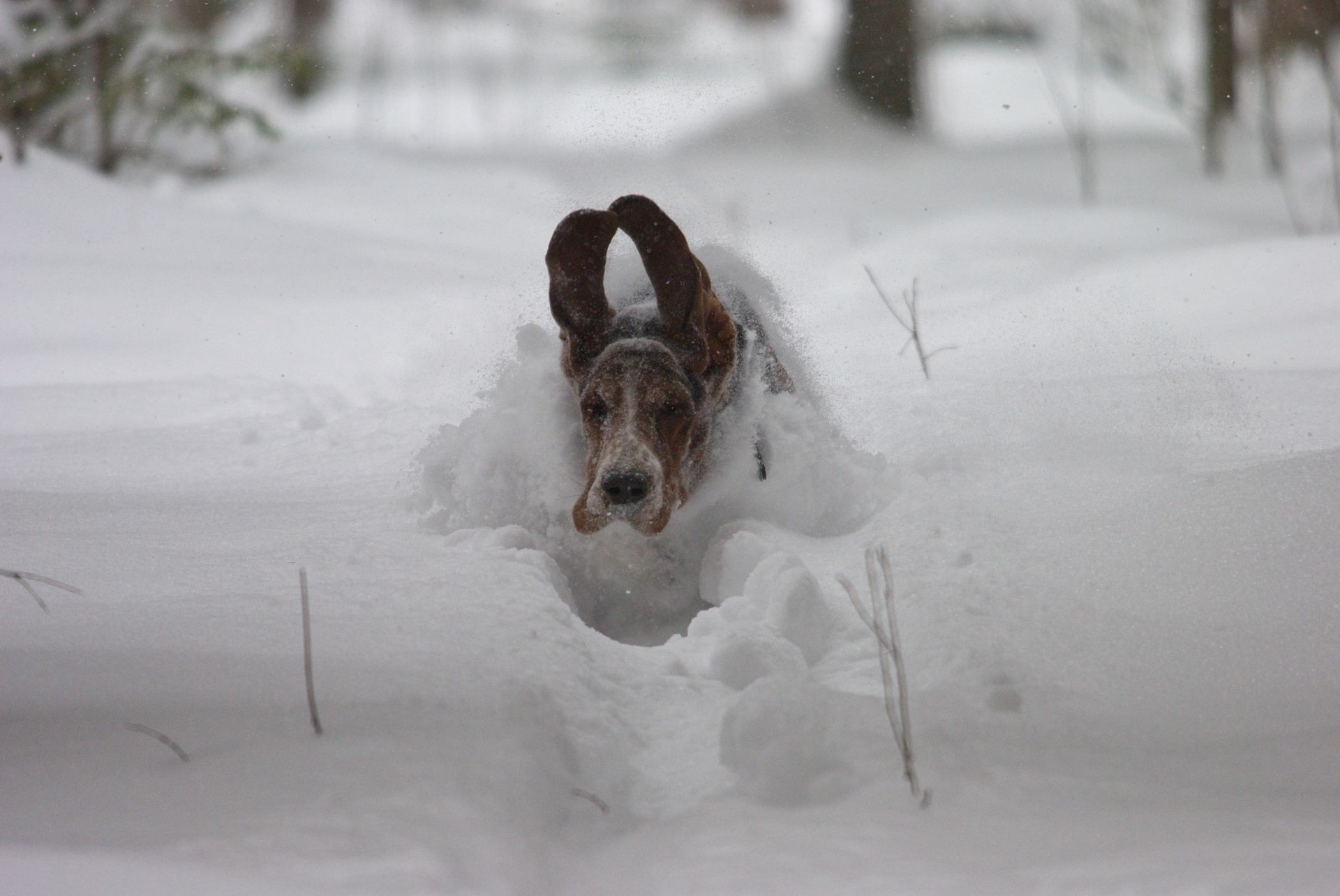 Der Hund im Schnee ist bei einem solchen Frost gefroren