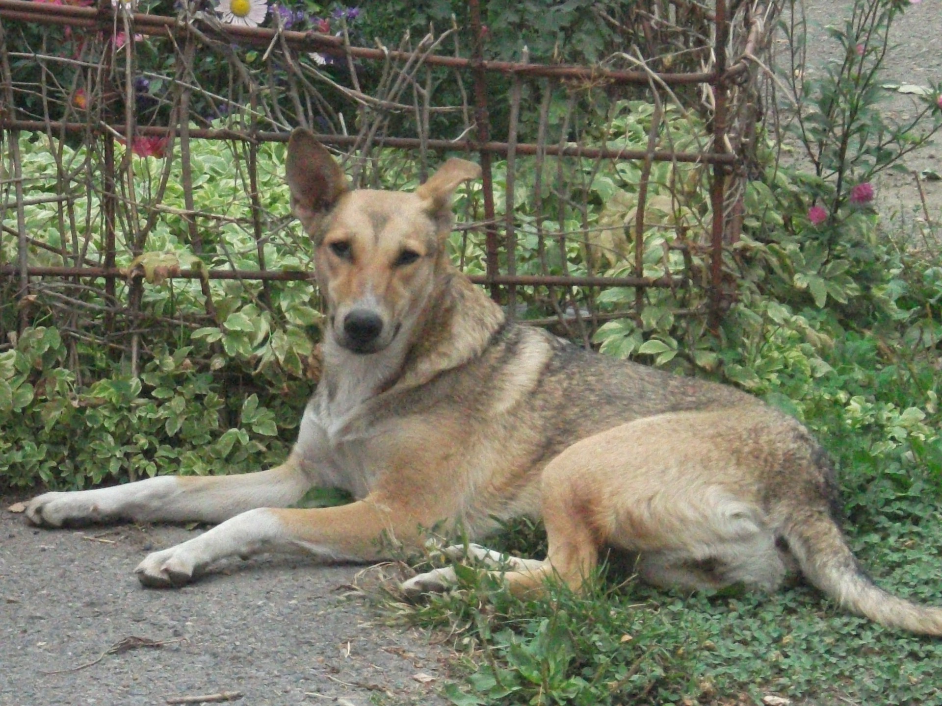 Ein großer Hund liegt auf dem Rasen