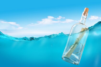 Flasche mit brief im sand auf dem hintergrund des meeresFlasche mit Brief im Sand auf dem Hintergrund des Meeres