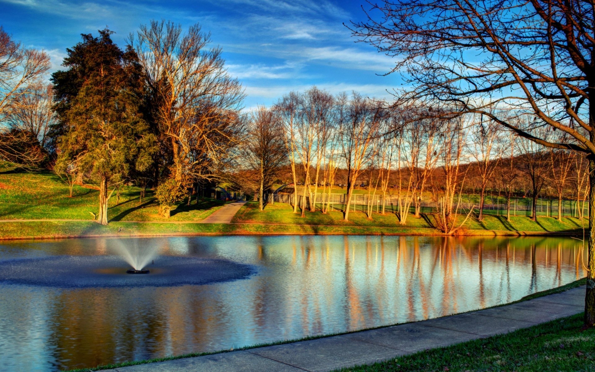 Ein Stadtbaum und ein leuchtender Brunnen am Fluss