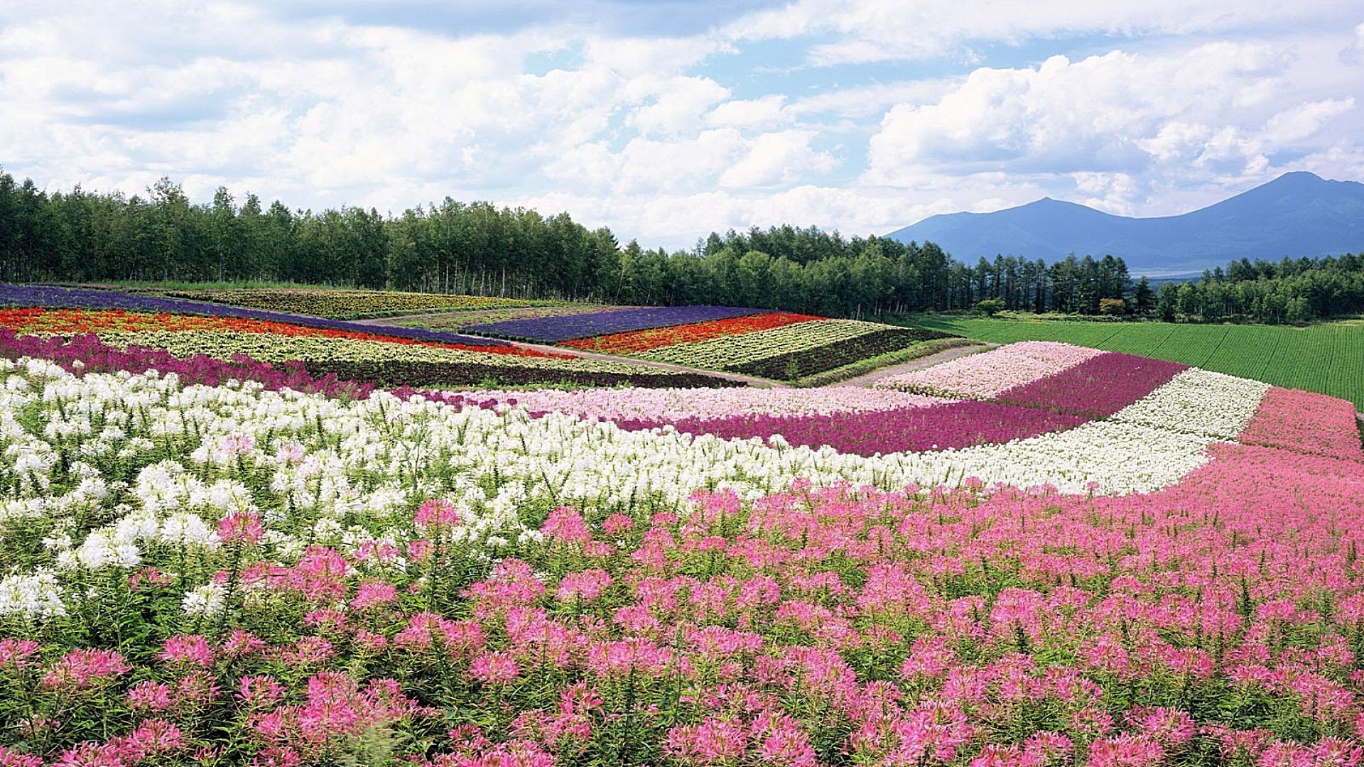 Bunte Felder von Blumen. Landschaft mit Bergen und Feldern