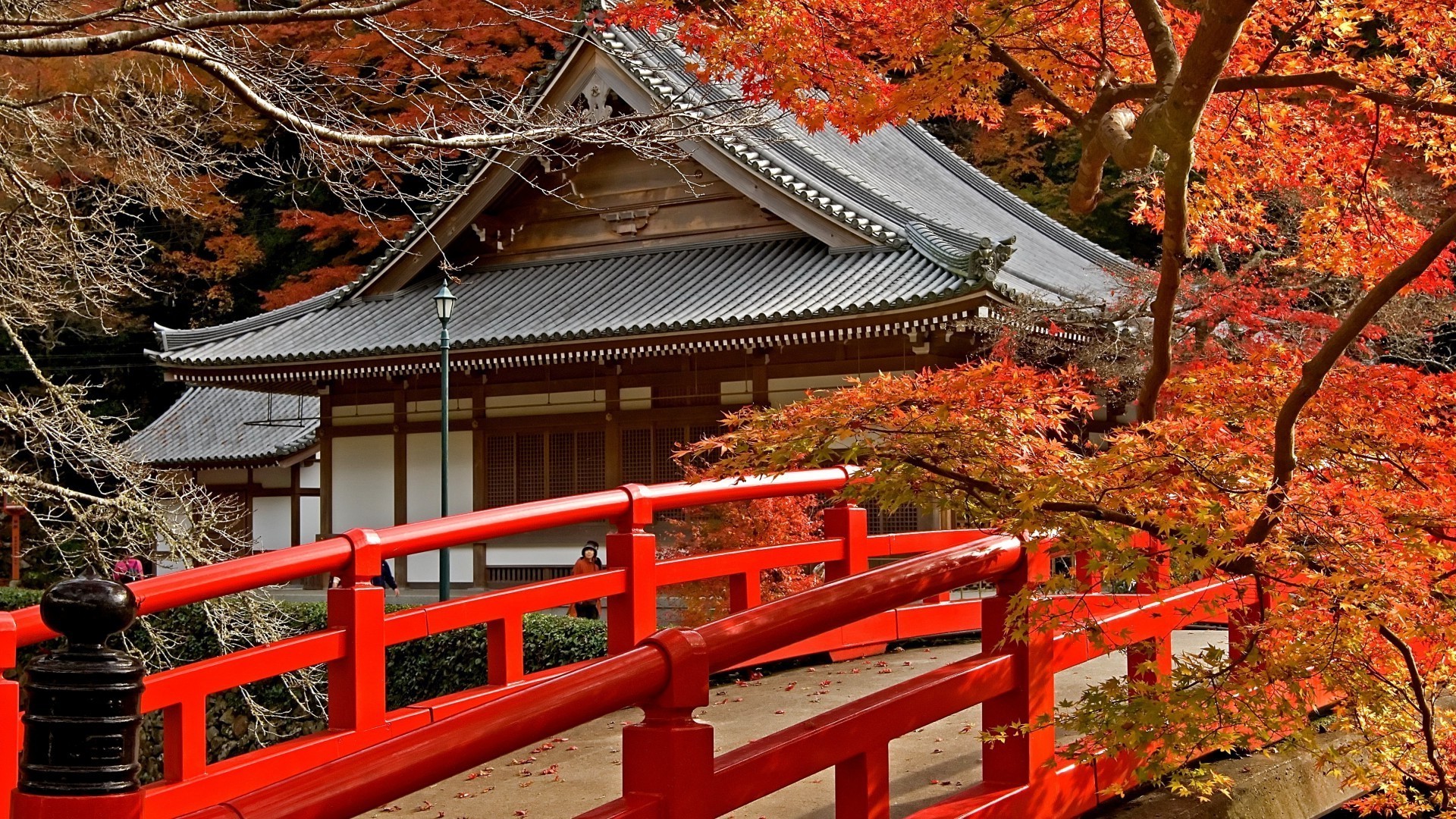 Schönes Dach. Eine Brücke. Rotes Geländer
