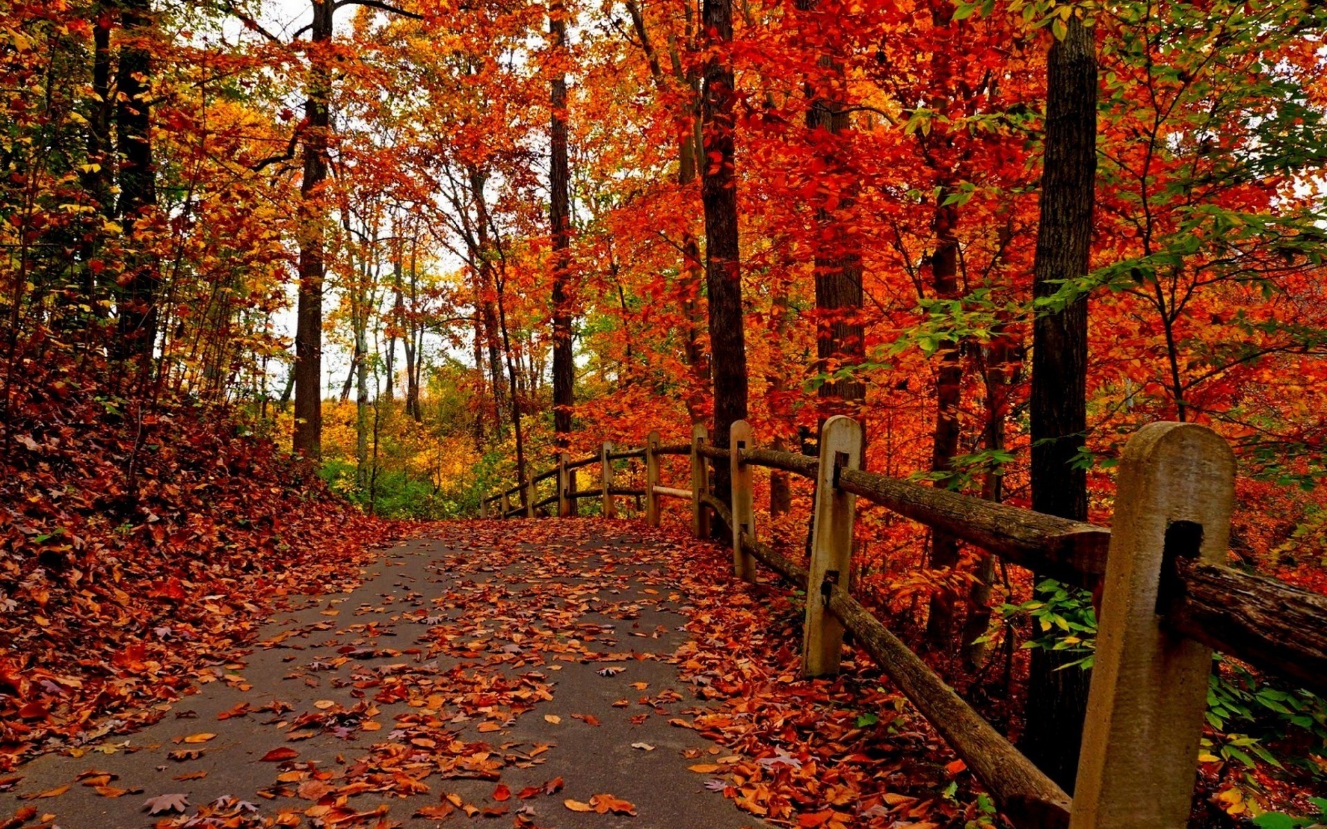 Eine Straße mit einem Zaun im herbstlichen rot-gelben Wald