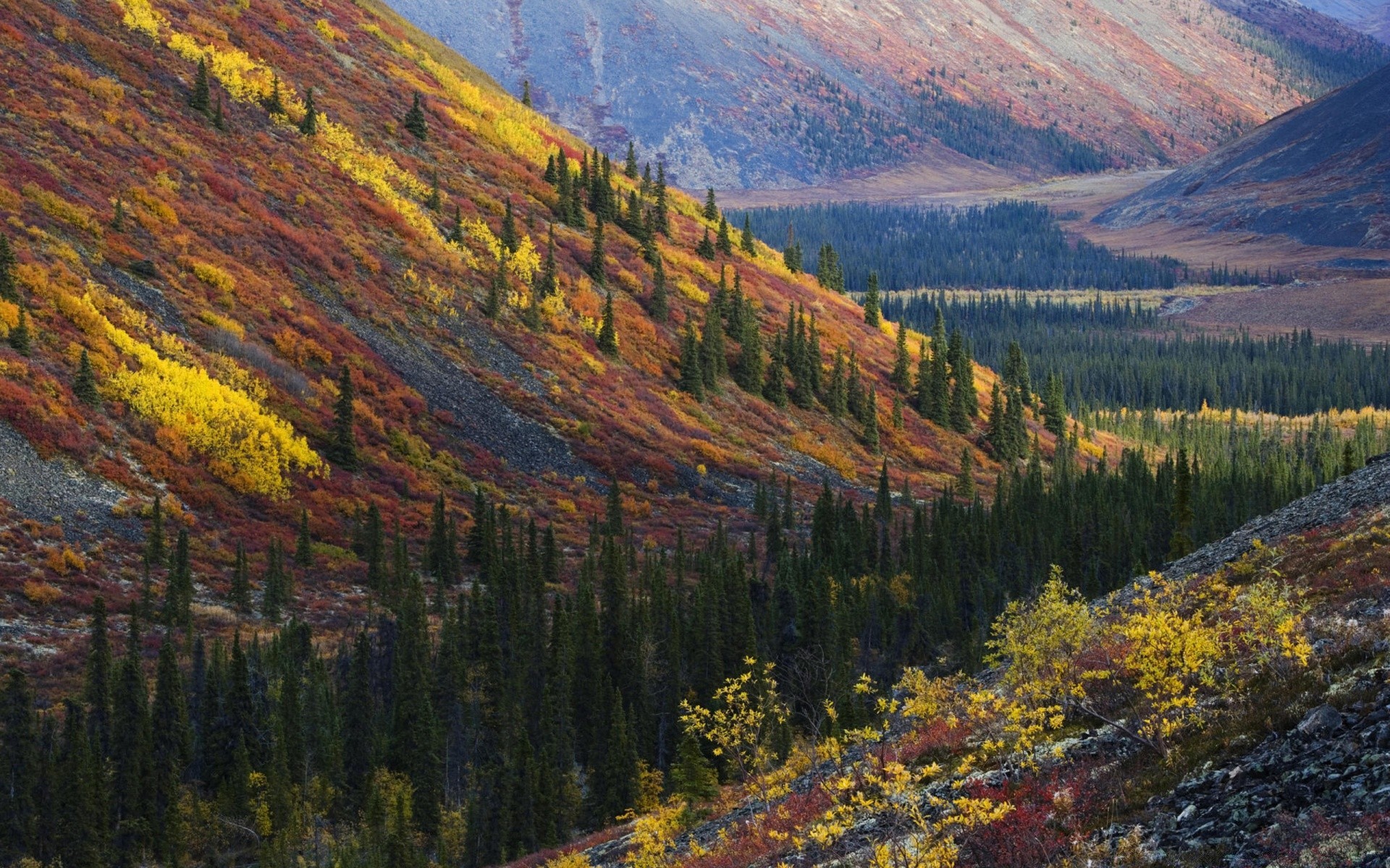 Die Sonnenstrahlen, die sich durch die Baumkronen bewegen