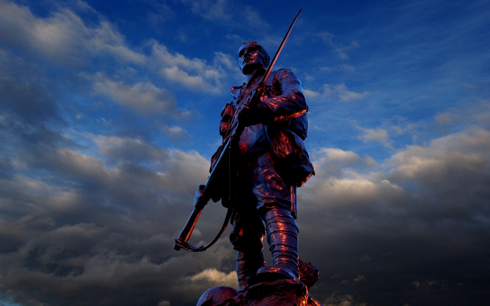Mann mit Waffe auf bewölktem Himmel Hintergrund