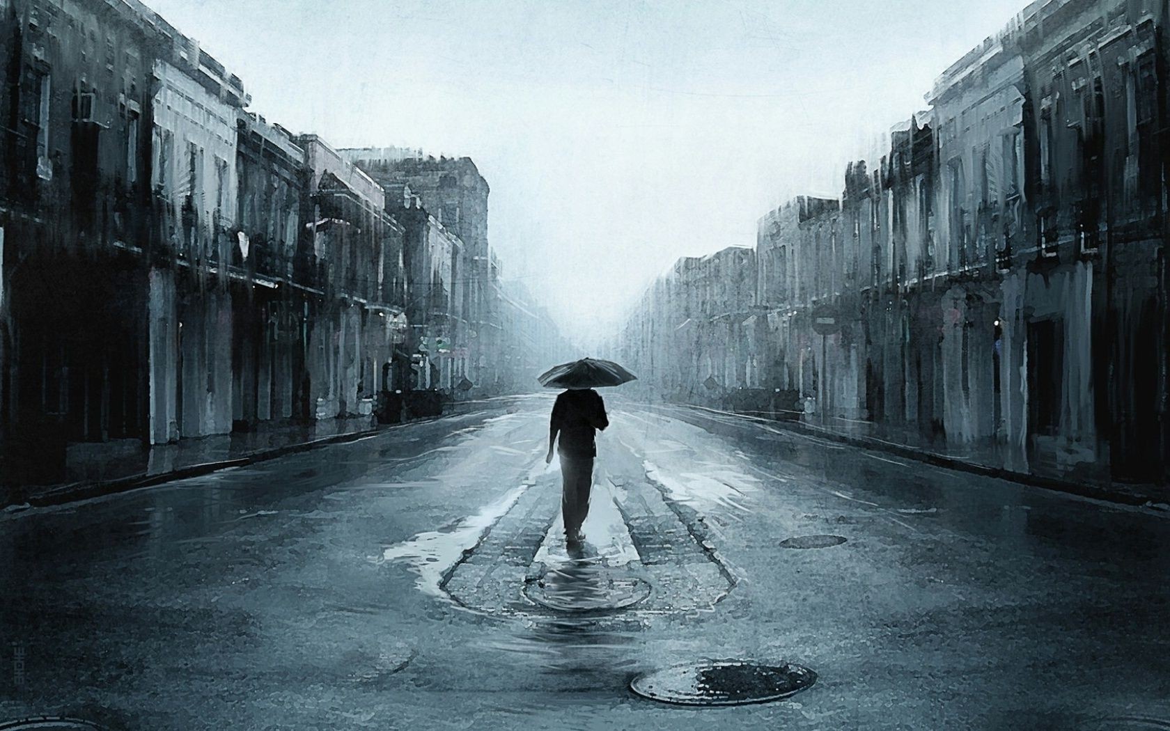 Die Straße ist im Regen leer, nur ein Regenschirm als Dach vor schlechtem Wetter