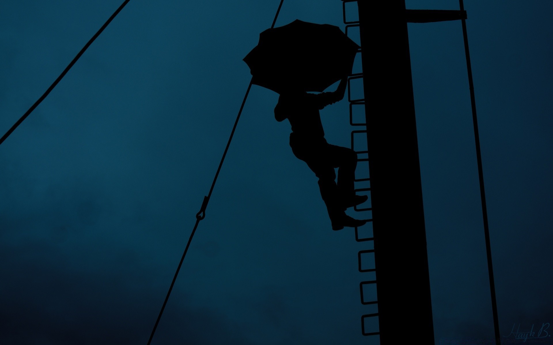 Mann mit Regenschirm, der die Treppe hinaufsteigt