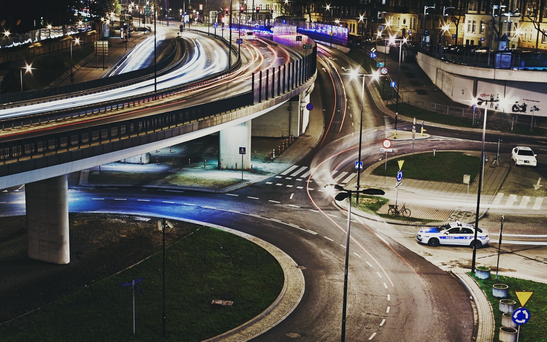 Verkehrsfluss der Autos verschwommene Lichter auf der Brücke