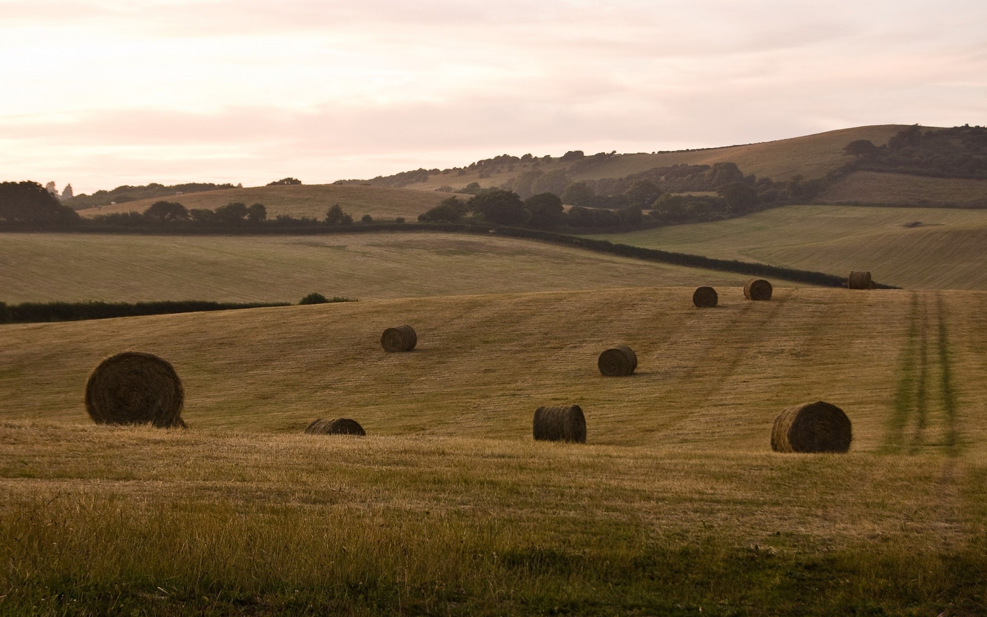 Europäische Landschaft mit Haufen von gesammeltem Heu